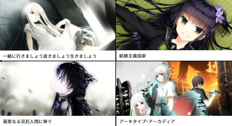 ウォーターフェニックスの作品『一緒に行きましょう逝きましょう生きましょう』『結婚主義国家』『最悪なる災厄人間に捧ぐ』『アーキタイプ・アーカディア』からお好きなキャラクターをお選び頂けます。