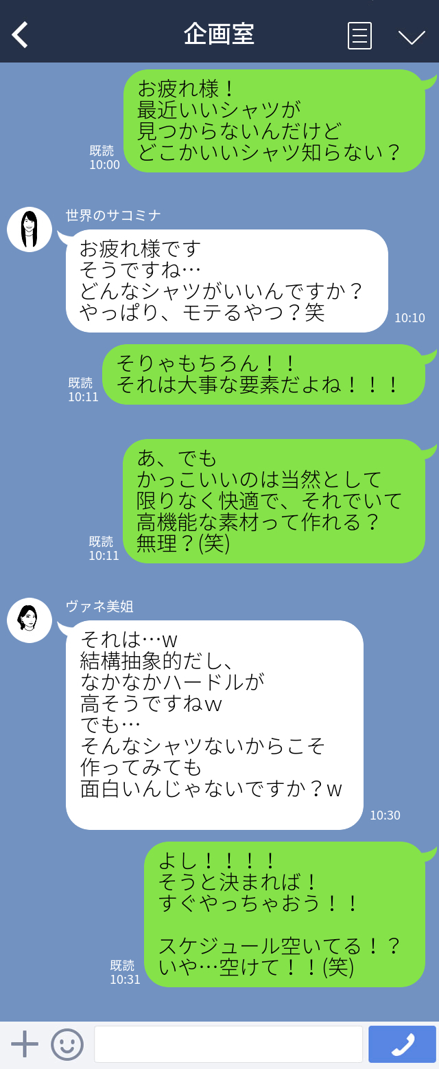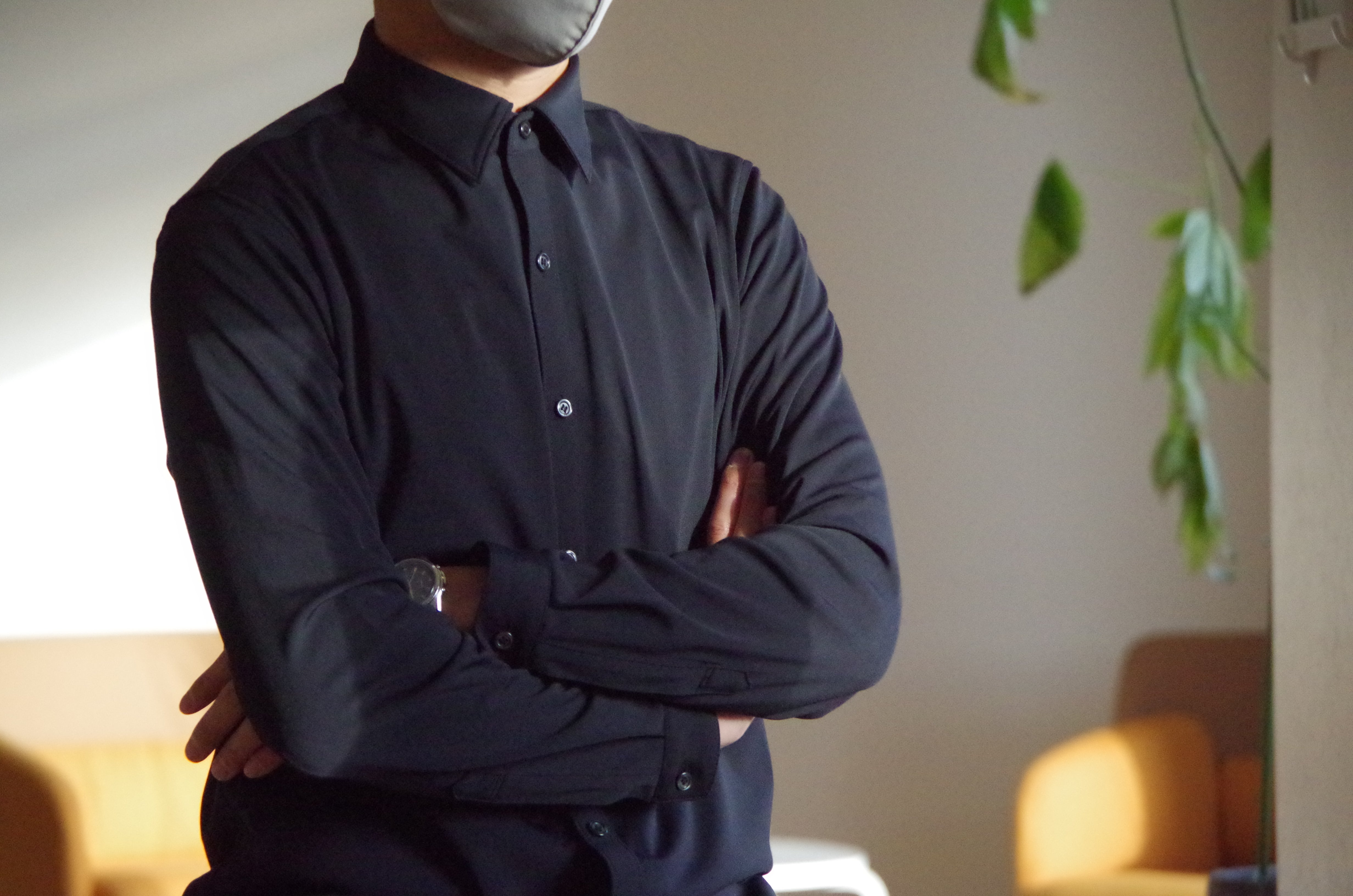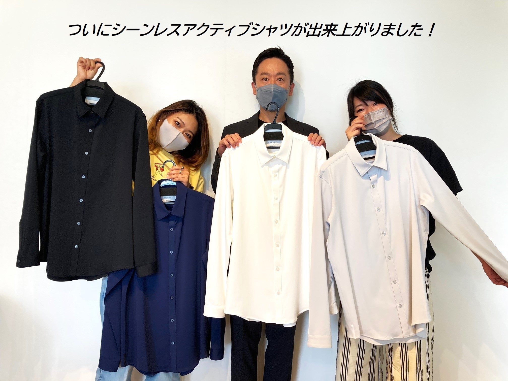 「どうせなら世の中に無い物を作ってみよう!」をコンセプトに、ビジネスシーンとアクティブシーンの両立が出来るシャツを試作した所、予想以上に着心地が良く、これなら多くの方に喜んで頂けると思いました。
