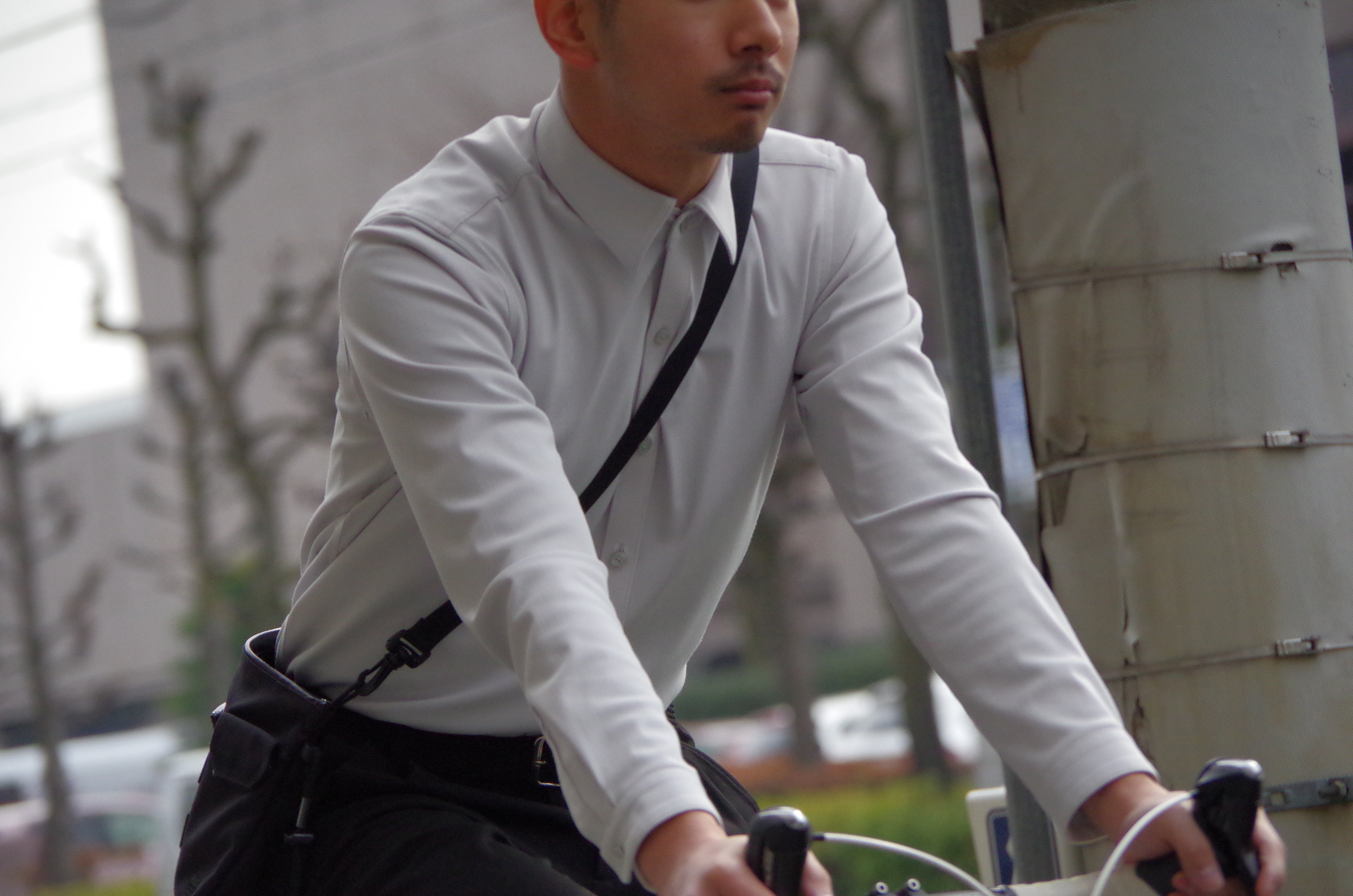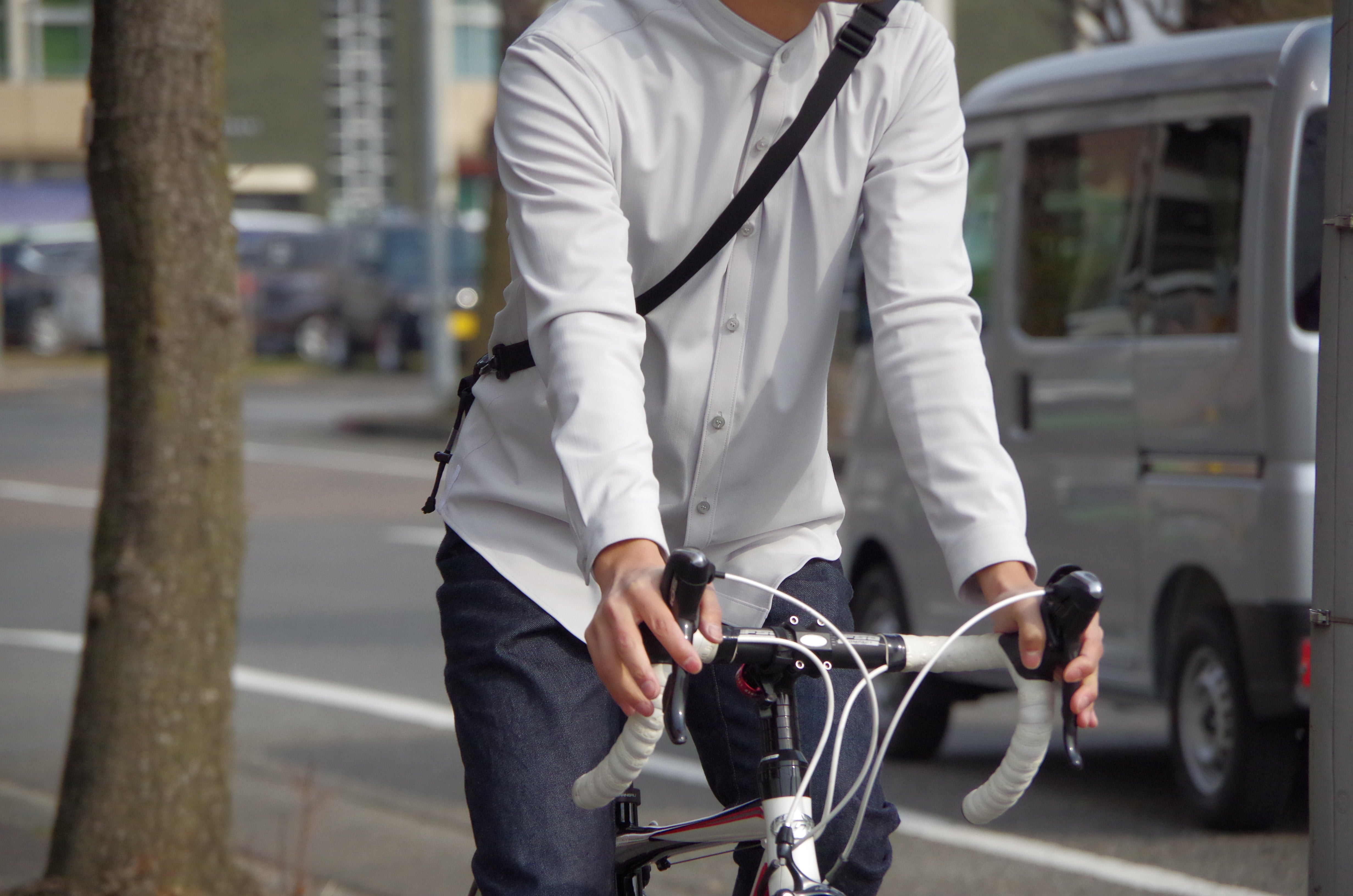 シーンレスアクティブシャツを着て、自転車で颯爽と出勤