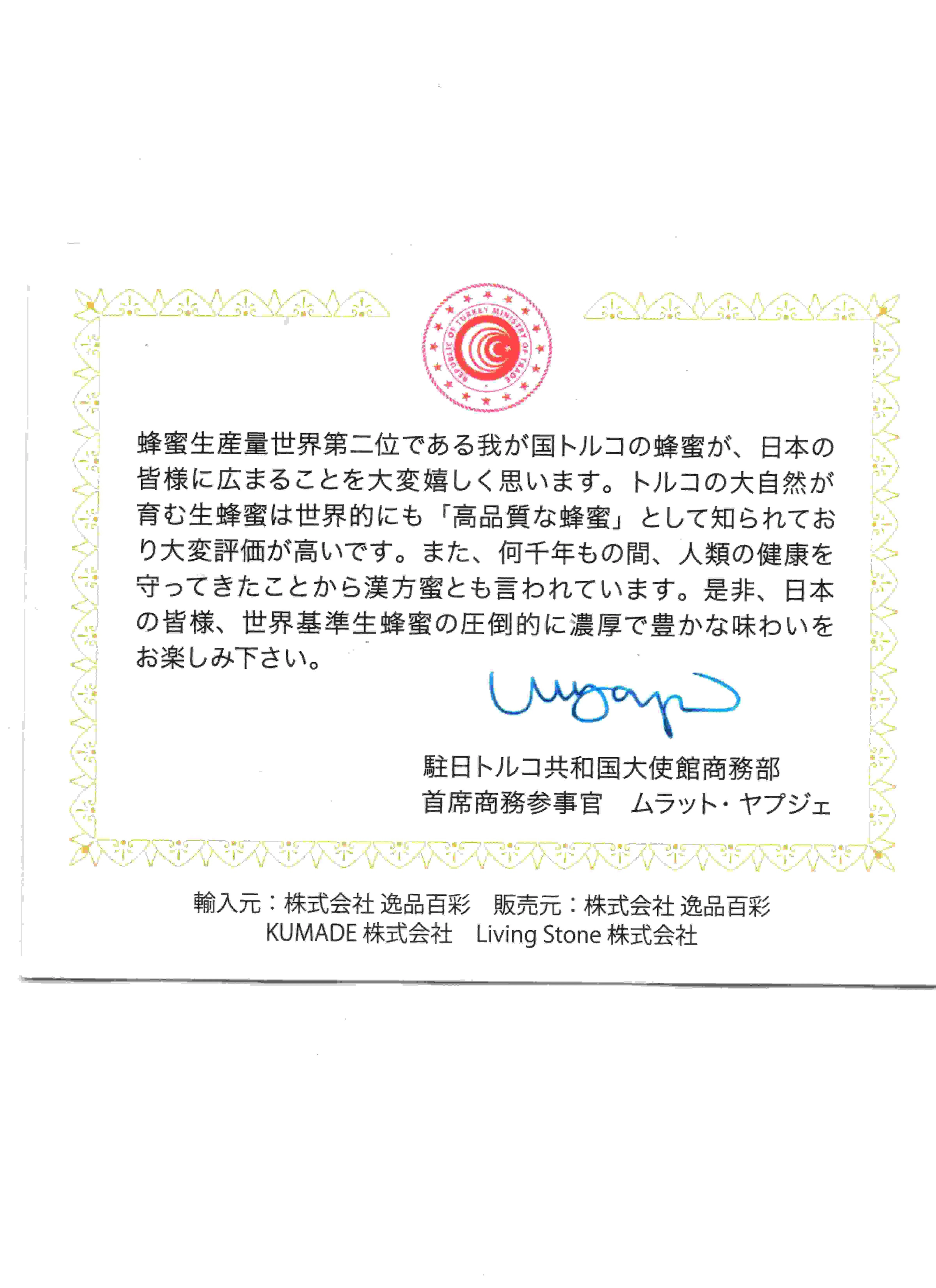 ヨーロッパの伝統⾷でもあります「松の生はちみつ」は、トルコで最も豊かな 天然松林があるチャナッカレ県のエーゲ海沿岸 の養蜂場で⽣産されています。世界の「松の生はちみつ」の93%がトルコ産と⾔われていますが、別名、⽢露蜜と呼ばれ、松の分泌液を好む昆⾍の分泌物をみつばちが収集し作られます。綺麗な琥珀⾊をしており、抗酸化作⽤と抗菌効果が特徴で、医療や⾷品分野等、さまざまな製品の天然添加物として使⽤されています。濃厚な⽢みがありながらもさっぱりとした味わいがあります。