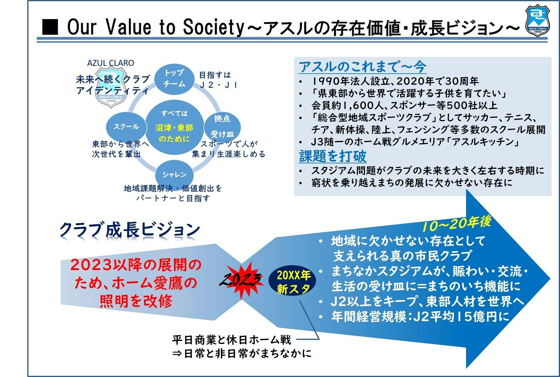 本クラウドファンディングやその他のご支援金はまず直近の照明改修に充てさせていただくものですが、一方で、「今回のピンチをしのげればいい」という考えでは、また、「静岡県東部からJリーグの灯をなくすな」というスローガンだけでは、事業体として早晩立ち行かなくなるのは明らかです。