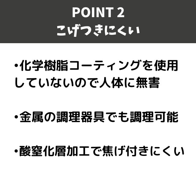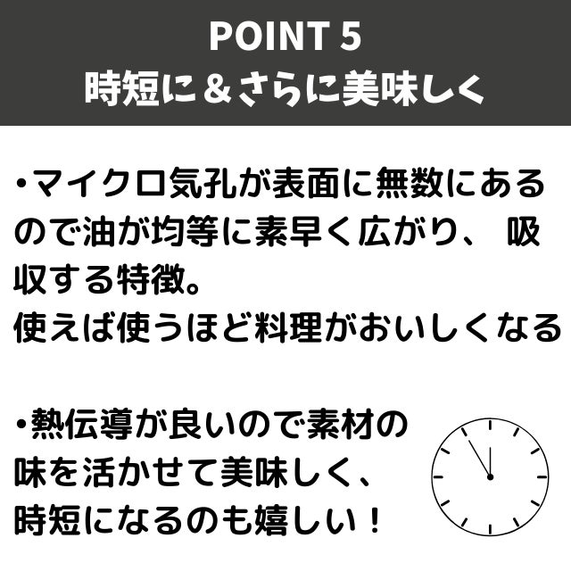 酸窒化層加工により表面のマイクロ気孔に油が吸収されなじみやすいため、天然のノンスティック機能が向上し、焦げ付きにくい性質があります。