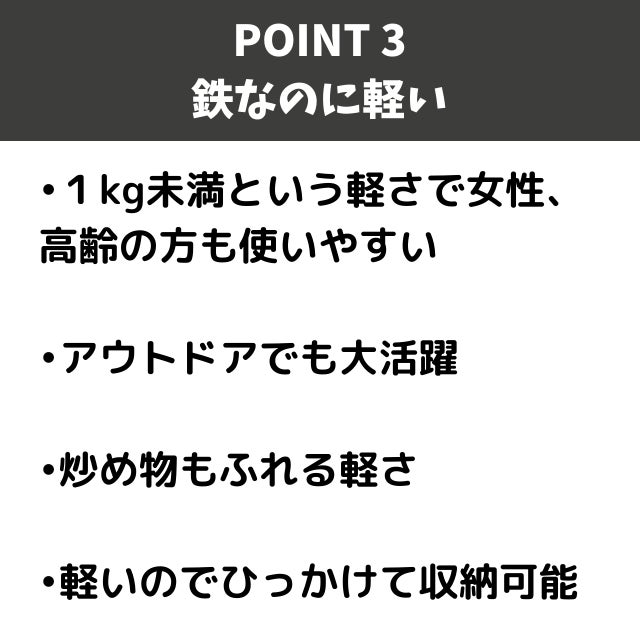 そのため、今まで「鉄は重そう」と諦めていた女性の方や高齢の方にもぜひ使っていただきたいです。