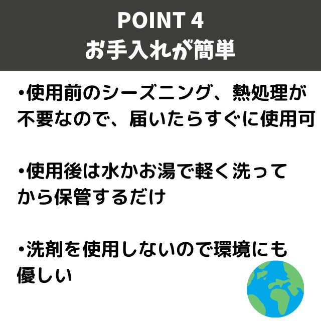 工場で出荷前にシーズニング処置を済ましているので、商品到着後は面倒な処理なくすぐに使用できるのも嬉しいです。