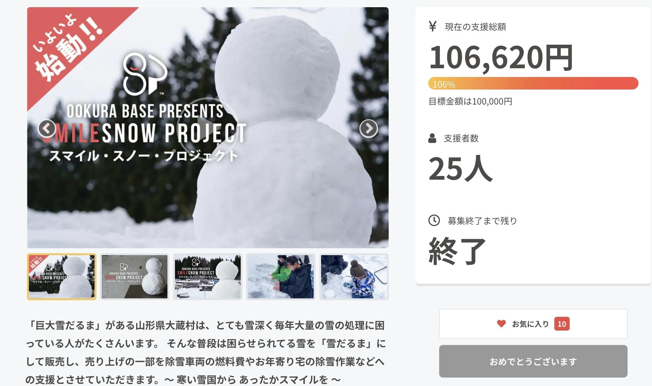 2022/02/21 10:52皆さまのご支援により本プロジェクトの目標金額を達成し、クラウドファンディングが終了しましたので、ご報告させていただきます。この度は、皆様のご支援、Facebook、Twitter、Instagram等のSNSでの拡散・シェアでのご協力により、プロジェクトが成功しましたこと、感謝申し上げます。【最終結果報告】最終支援総額:106,620円目標金額:10万円達成率:106%支援者数:25人これからのスケジュールですが下記の予定で動いてまいります。・2022年2月20日(日) クラウドファンディング終了同日/除雪支援作業・2022年2月21日(月) 順次「雪だるま」発送・2022年2月下旬 「除雪作業」と「雪景色」風景フォトリターン予定・2022年3月31日(木)CAMPFIREより出金予定・2022年4月上旬 「春の大蔵村」風景フォトリターン予定・2022年12月予定 スマイル・スノー・プロジェクト.2023❇︎リターンの配送日などに関してはこれからの作業となるため、また詳細が決まり次第、個別メッセージにてご連絡いたします。山形県大蔵村除雪支援【スマイル・スノー・プロジェクト】は、来年も行う予定です。次回の返礼品は大蔵村の特産品なども計画しています。来年も引き続きよろしくお願いいたします。大蔵BASE スタッフ一同 もっと見る