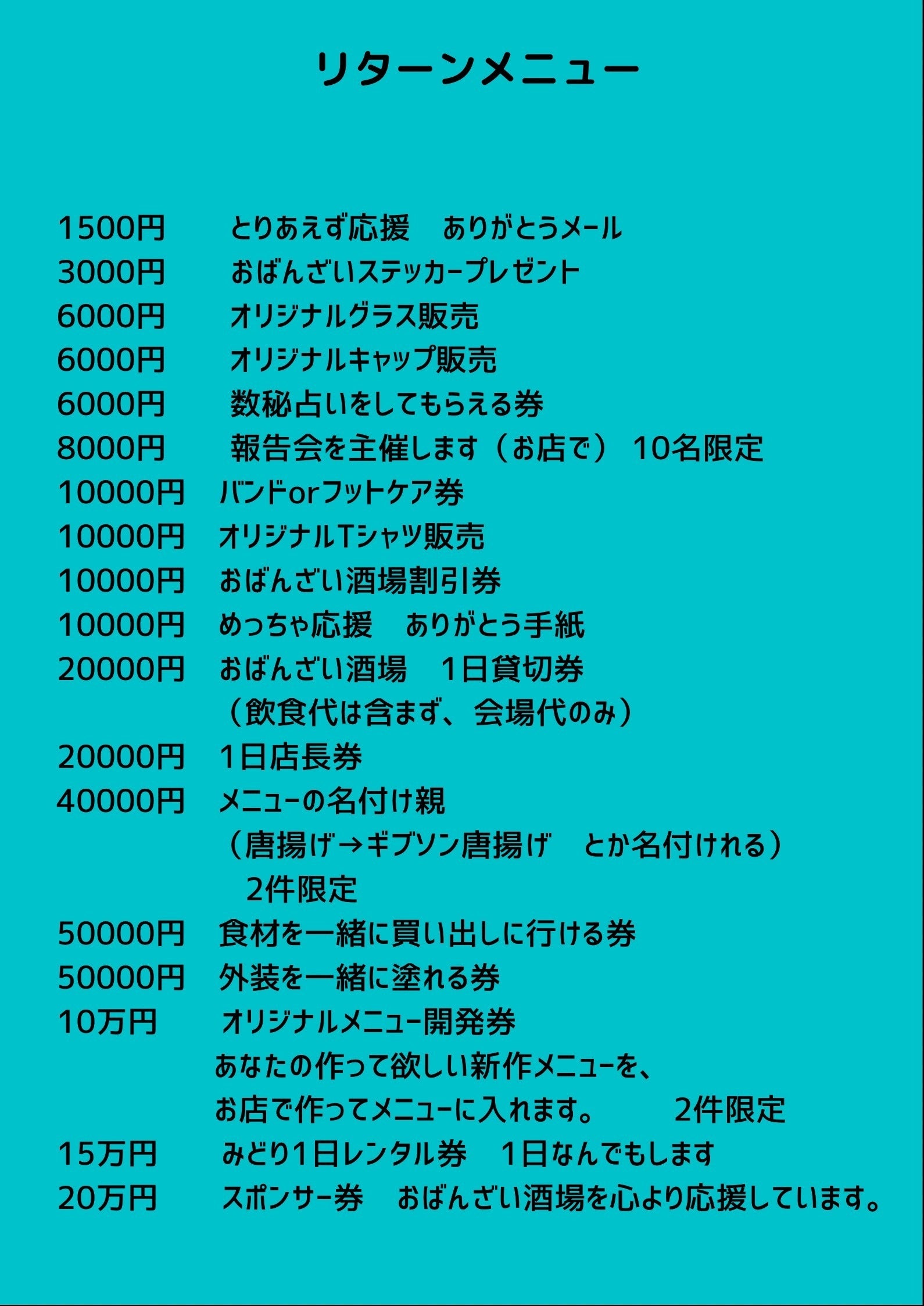 私にできること、喜んでもらえそうなリターンメニューを一生懸命考えてみました。