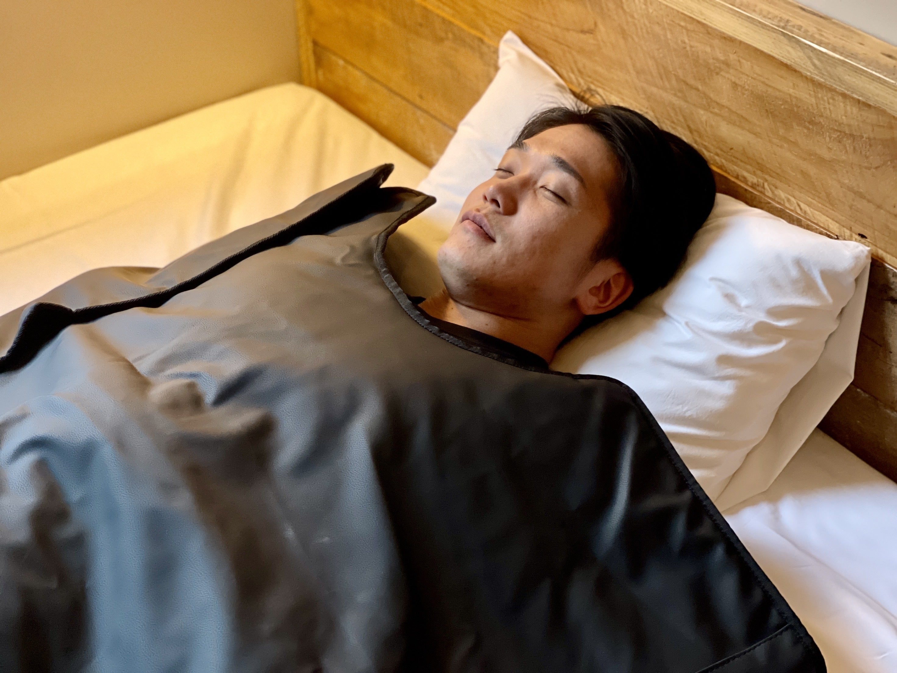 サウナブランケットを試したモニターの方にレビューをしていただきました。実際試していただくと、リラックスされて、全身から汗がしっかりでていらっしゃいました。