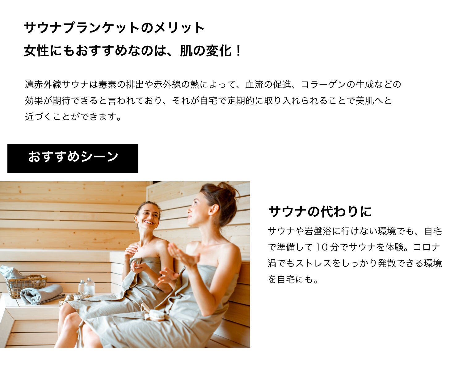 サウナブランケットは、サウナーに限らず、普段汗をかく機会が少ないオフィスワークの女性にもおすすめです。サウナや岩盤浴を愛好する女性の多くが、汗をかくことでのダイエットやデトックス効果を期待する女性も多いです。サウナブランケットは、汗をかくことで肌の新陳代謝を促すことも可能です。汗をかき、デトックスをすることで肌の変化にも注目していただきたいです。