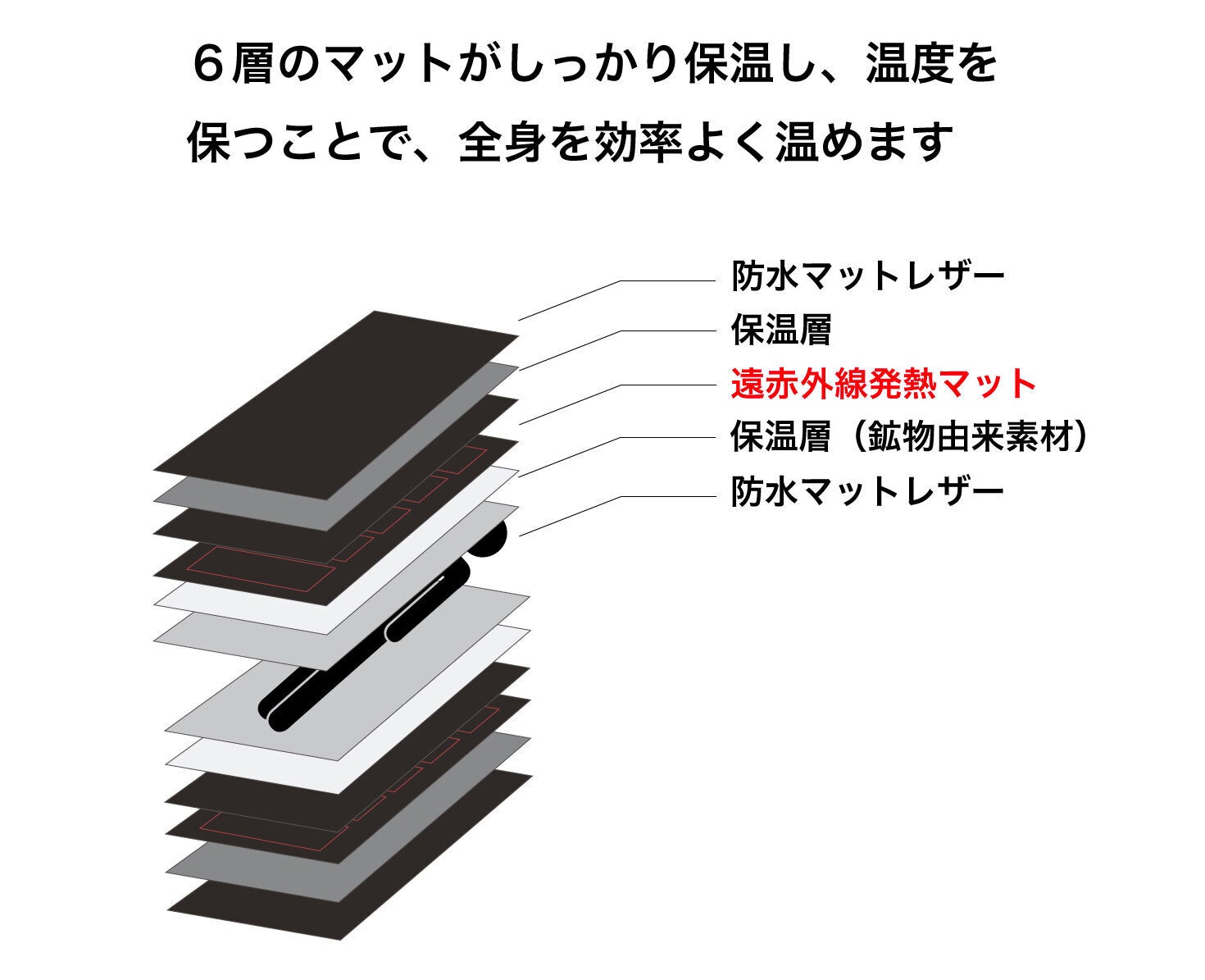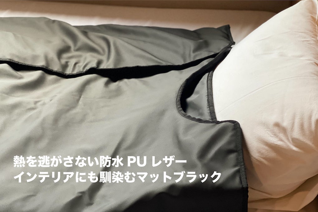 サウナブランケットのイメージが湧きづらい方もいらっしゃると思いますが、スイッチを入れて温度調整をして保温することで、全身がしっかり温まります。重厚感のある防水マットレザーがより体に密着して温めてくれるので、全身の力を抜いてリラックスする時間を楽しんでいただけます。