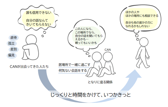 その人のタイミングや気持ち、つまりその人自身を大切にするからこそ、支援の押し付けや拙速な解決ではない、隣にいる、一緒に考えるという支援を、CANさんは大切にするのだろうなと感じます。