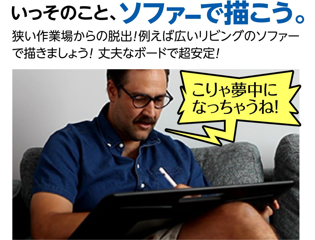 こうして、ソファーやベッドではひざの上で描き、 折りたたみ式の脚を使えば、どんな平らな場所でも快適に作業できる“Sketch BoardPro”が、誕生しました。