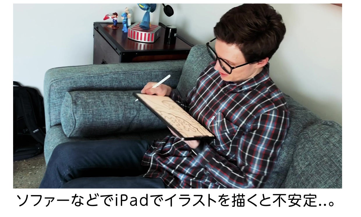 開発されたきっかけも J J 氏が、iPadで仕事のイラストを描き続けて行くことで始まりました。毎日何時間も使い続けることで、特に机以外の場所、ソファーなどでアイディアが湧いた時に集中して描き込んだ為に、指や手のしびれが出て、やがて首筋をかなり痛める結果となりました...。