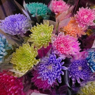 今回のプロジェクトの、トップ画像のレインボーマムを作ってくださった都築菊園さんのカラーリングマムがAcoop一色店で発売中です。