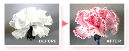 花は、染色剤を混ぜた水に生けることで、水を吸い上げる力がはたらき自然に染まっていきます(茎が短いほど早く染まります)。染色剤を何色も混ぜて、自分だけのオリジナルカラーをつくることもできますので、じぶんや贈る相手の好きな色にしてみるのもいいかもしれません。