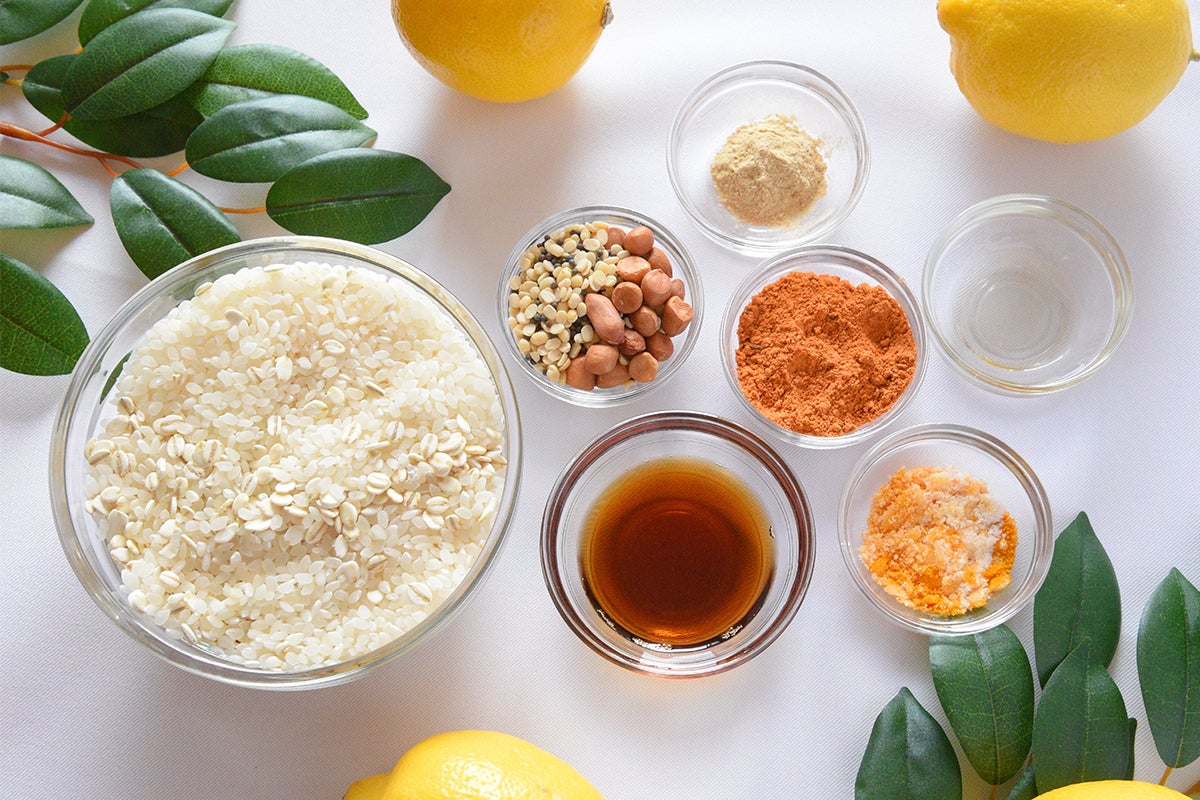 ・原材料名:米、押し麦、ピーナッツ、マスタードシード、ウラッドダル、ナンプラー、ターメリック、砂糖、ヒング、ジンジャーパウダー、レモンオイル、クミンパウダー、コリアンダーパウダー、キャラウェイ、ガーリックパウダー、カイエンペッパー、パプリカパウダー