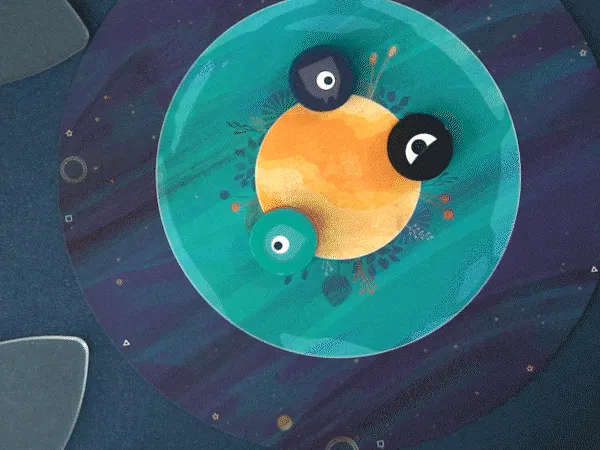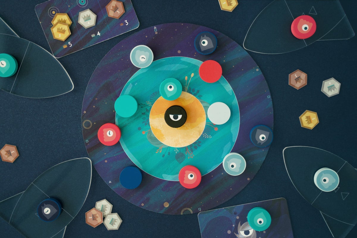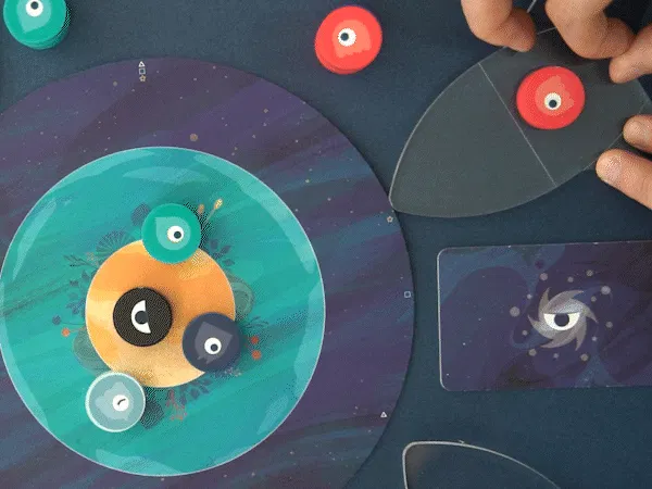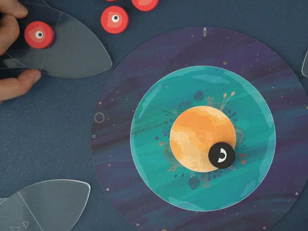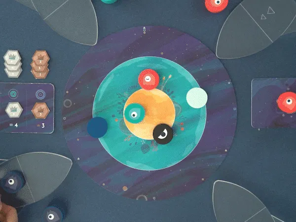 4つのコマを順番に指で弾いて、惑星にどれだけ自分のコマをおけるか競います。