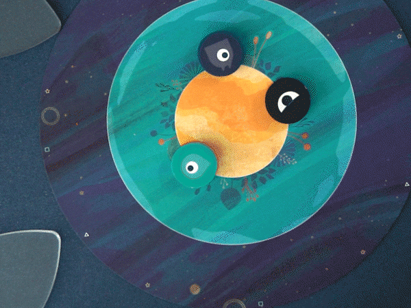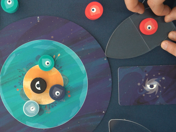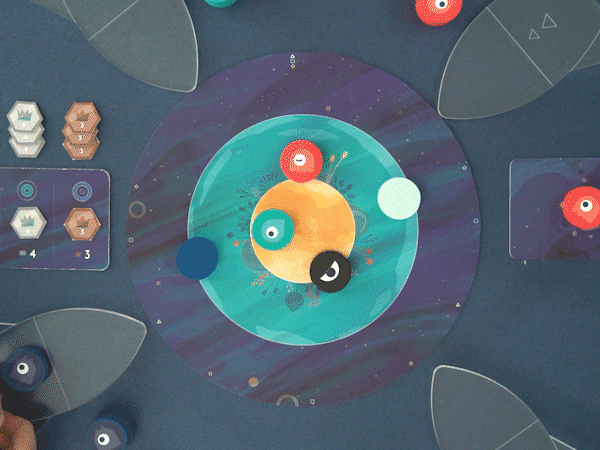 4つのコマを順番に指で弾いて、惑星にどれだけ自分のコマをおけるか競います。