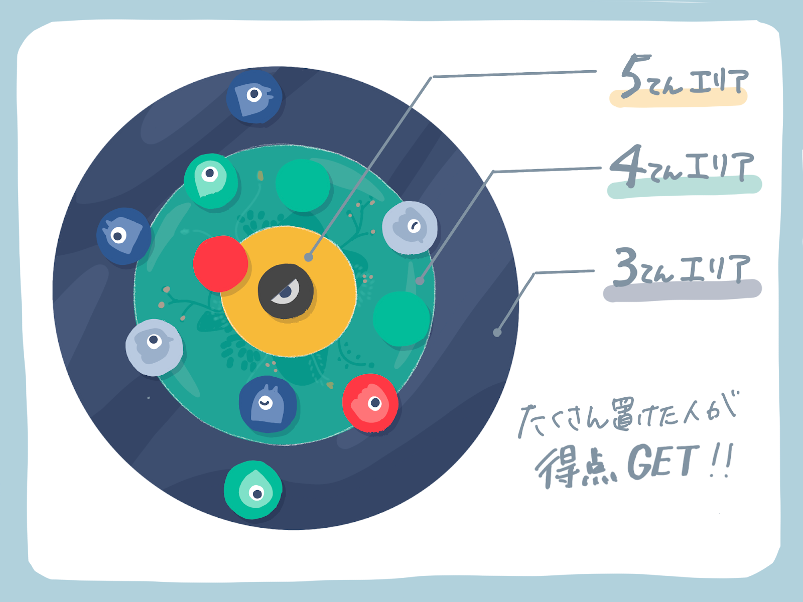 惑星は3エリアあって、1つのコマ=2パワーとして、エリアごとに一番パワーをもっている人が得点できます。