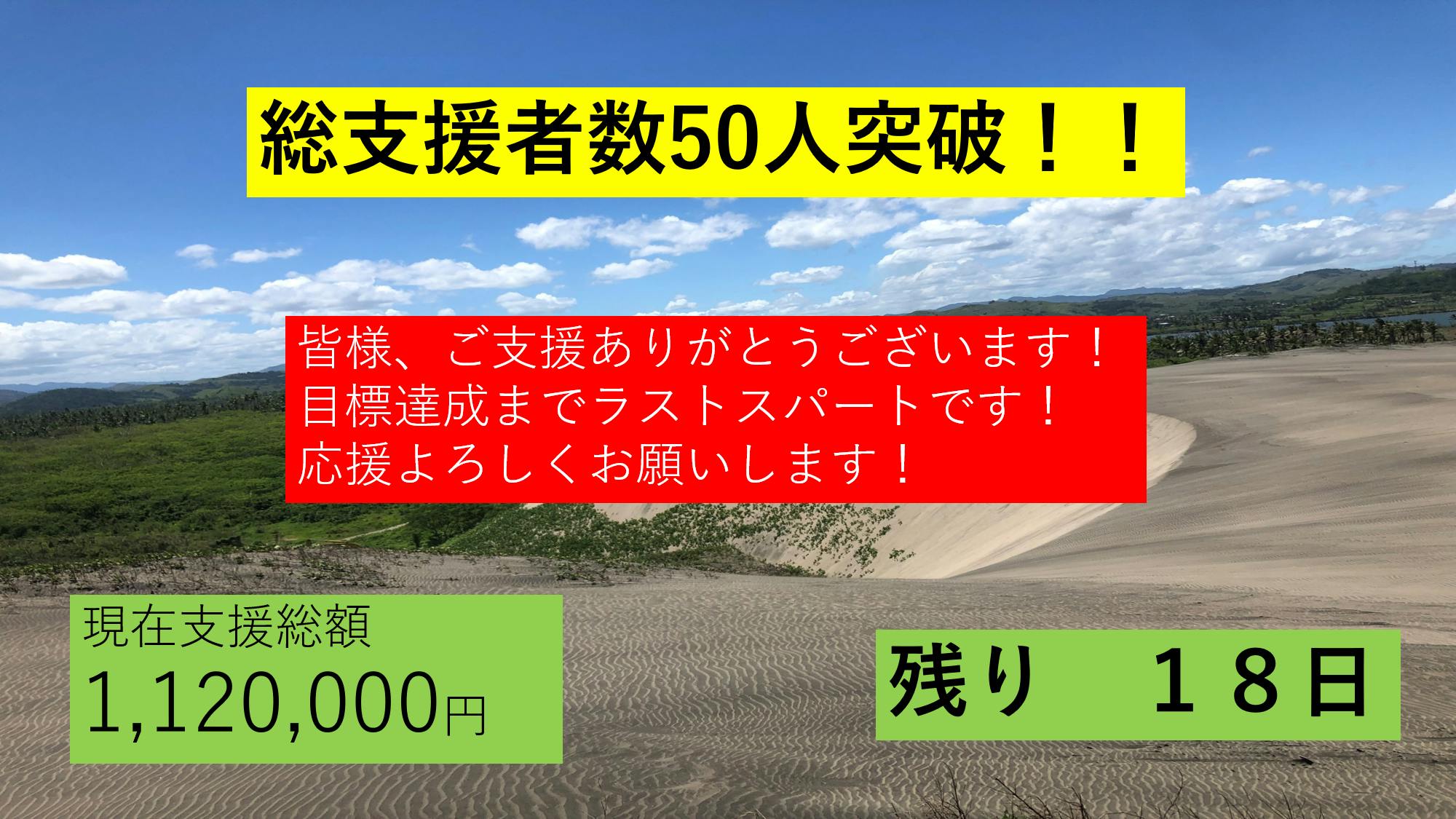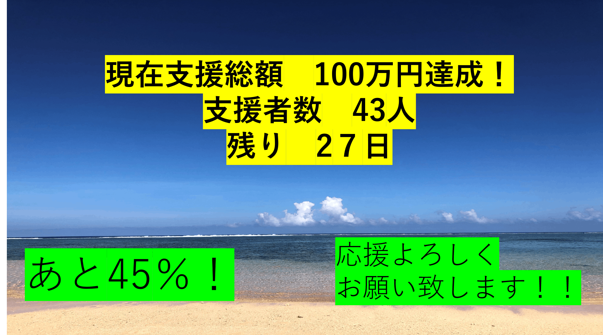 2022/03/07 18:13皆様、ご支援していただきありがとうございます!支援者数が50人突破しました!本当にありがとうございます!!クラウドファンディングも、残り18日となりました!!!必ず目標達成させます!皆様のお力をお貸しください!!よろしくお願いします!!! もっと見る