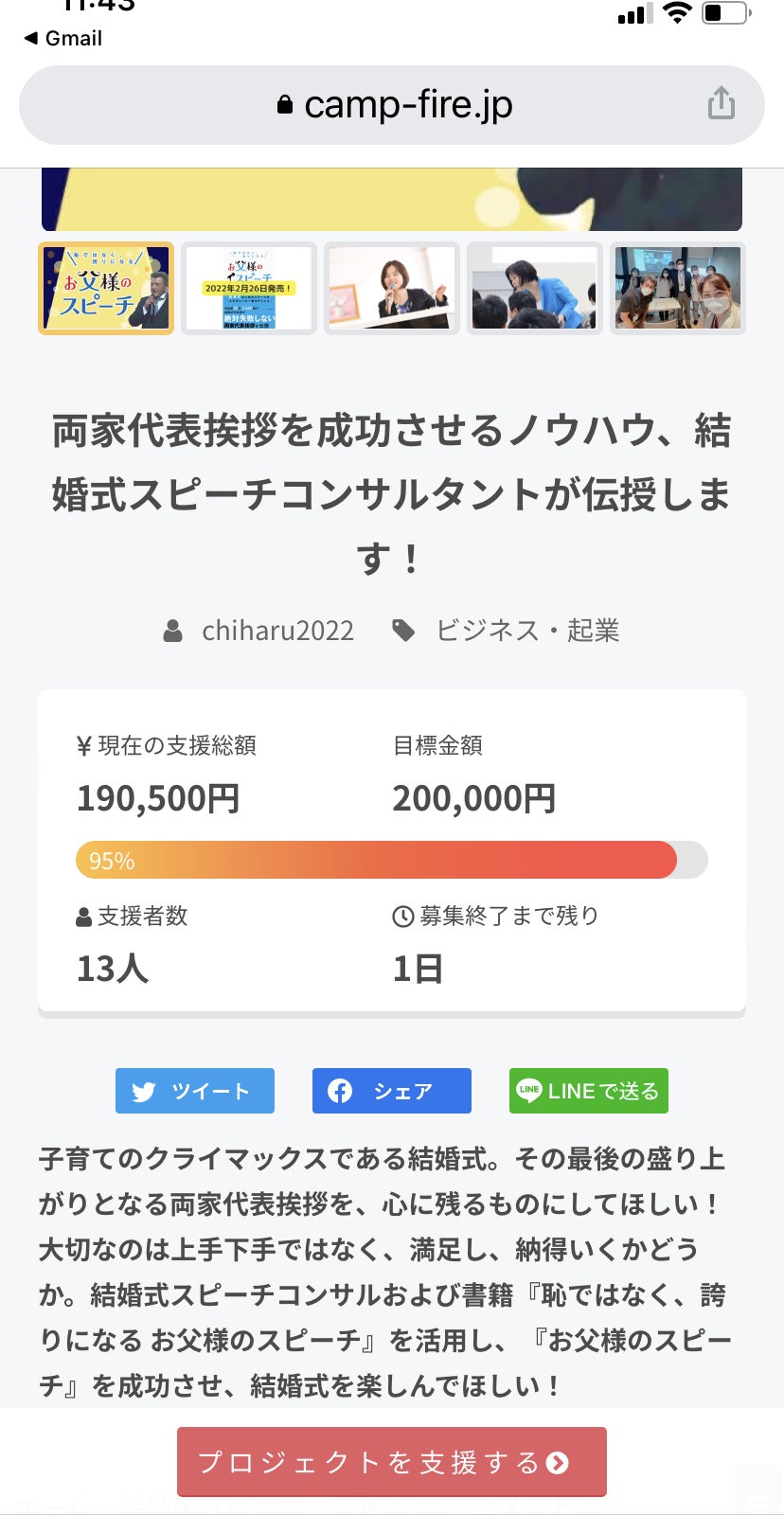 2022/03/29 12:16クラウドファンデング残すところあと1日目標額に向けてあと一歩の ところまでやっときましたあたたかいご支援を忘れることなくオヤジからお父様に変身できるスピーチのサポートしていきます!お一人お一人に寄り添いながら最善を尽くしていきます^^ もっと見る
