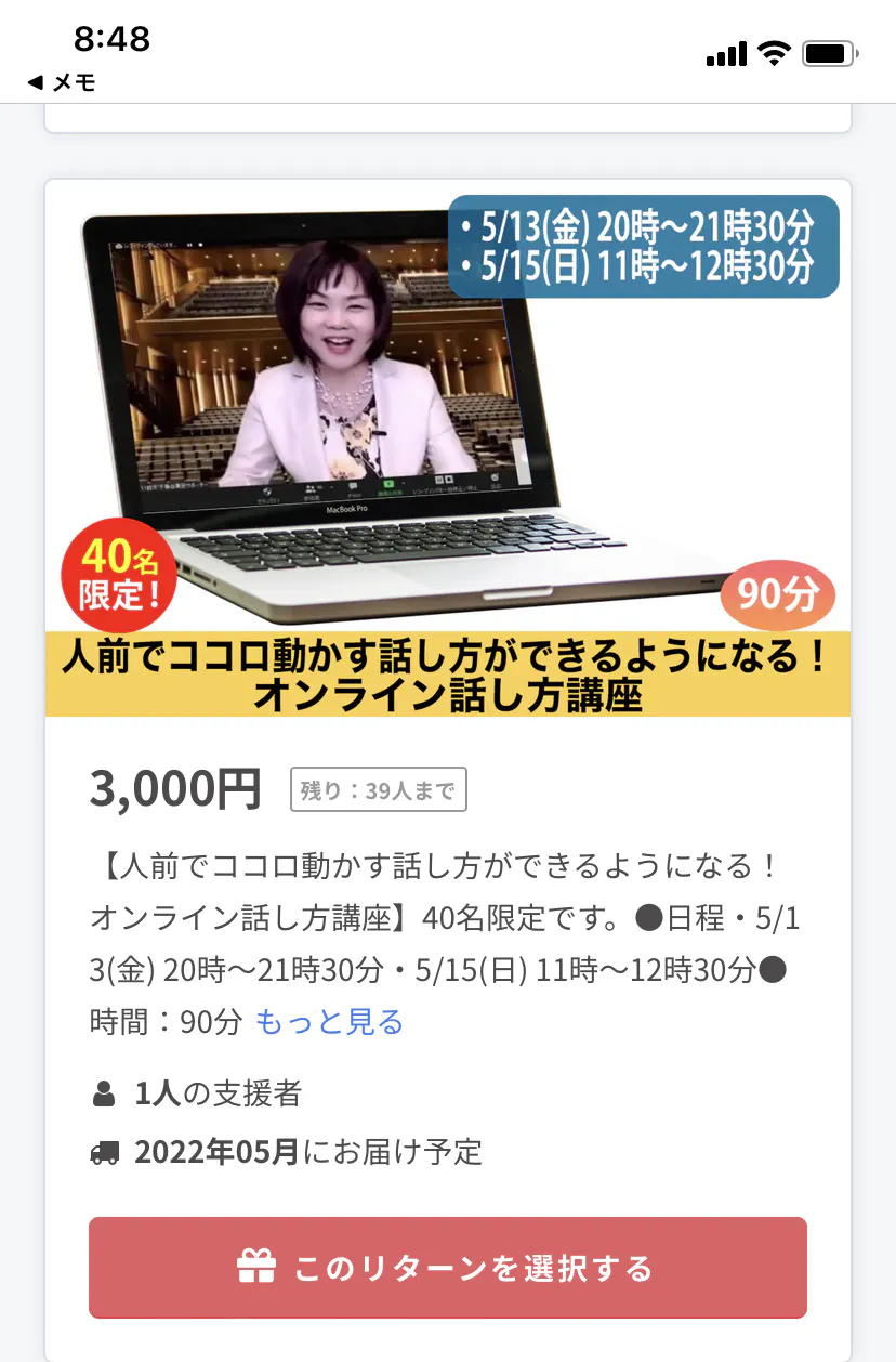 2022/03/27 10:55【クラウドファンデング終了まで3日】『話し方が変われば人生が変わる!』こんなキャッチを聞いた事はないですか?今より人前で、想いが伝わる話し方をしたい!人に好かれる話し方を学びたい!オンラインでも良い印象をあたえる声や話し方に興味があるそんなあなたに朗報です。クラウドファンデングのリターン商品として想いが伝わる話し方講座をご提供しています。5/15(日)にzoomにて開催!90分3000円!(クラウドファンデング参加の特別価格)しばらく一般の方向けの話し方講座は、行う予定はないです。ご興味ある方は、ぜひ、この機会に参加してください。クラウドファンデング終了まで3日ですので締め切りが近づいています! もっと見る