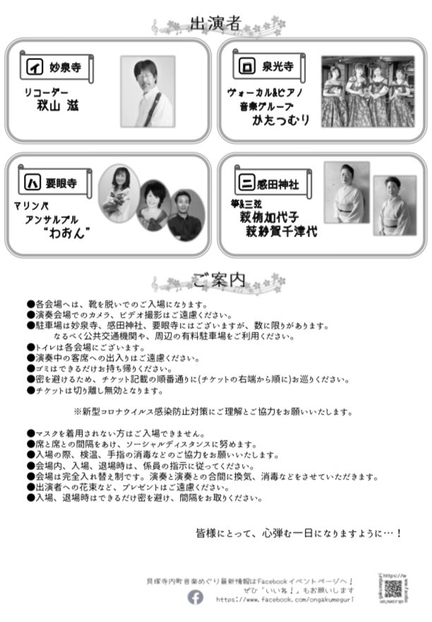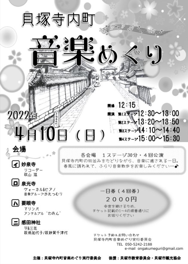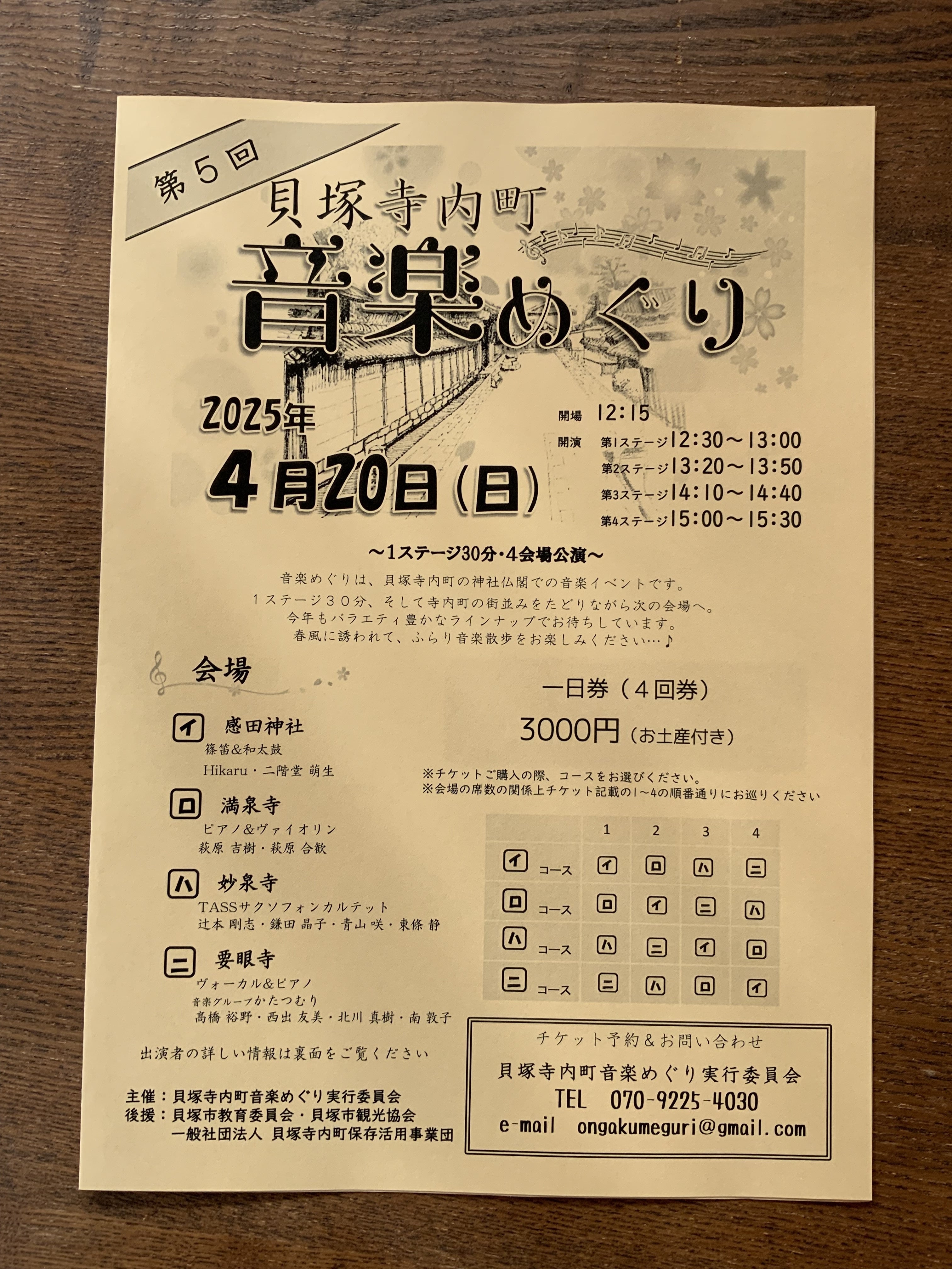 2025/02/14 09:51一年ぶりのご無沙汰です、みなさまお元気でいらっしゃいますか?今年の冬は寒くて寒くて、道路も閉鎖されるほどの寒波がきたりしてビックリですね。そんな寒い中ですが、ひっそりと第五回貝塚寺内町音楽めぐりのチケット販売開始しています。今年は4/20(日)です。時間は①12:30〜13:00 ②13:20〜13:50 ③14:10〜14:40 ④15:00〜15:30で、チケットに記載された会場を順に巡っていただきます。この頃にはもう春の陽気であたたかく、寺内町を散策するのに良い季節ですね。[イ]感田神社…篠笛&和太鼓 Hikaru・二階堂萌生[ロ]満泉寺…ピアノ&ヴァイオリン 萩原吉樹・萩原合歓[ハ]妙泉寺…TASSサクソフォンカルテット 辻本剛志・鎌田晶子・青山咲・東條静[ニ]要眼寺…ヴォーカル&ピアノ 音楽グループかたつむり と、今年も多種多様な音楽が楽しめる出演者にお越しいただけることになりました!一日券は4ヶ所巡っていただけて、今年は初のお土産!もついてきて3,000円です。巡り順はチケットにより決まっています。[イ]コース・感田神社スタート→イロハニ[ロ]コース・満泉寺スタート→ロイニハ[ハ]コース・妙泉寺スタート→ハニイロ[ニ]コース・要眼寺スタート→ニハロイの順に巡っていただけます。ご購入の際、ご希望のコースをお申し出ください。すでに[イ]コースは売り切れに近い状態ですので、ご希望のコースがありましたら、お早めのご購入をおすすめします。また、今年も要眼寺にて呈茶席を設ける予定です。熟練(30年以上!)の茶道経験者の方々に点てていただくお茶とともに、美味しい和菓子がついておひとり様1,000円です。要眼寺さんの美しいお庭と茶室に入れるチャンスはなかなかないですよ、オススメです。開始時間は第4ステージが終わった後の15:30〜です。チケットご購入の際に一緒にお申し出ください。お問い合わせは、貝塚寺内町音楽めぐり実行委員会メール ongakumeguri@gmail.com電話 070-9225-4030(電話番号が今年から変更しています。ご確認ください)お気軽にお問合せください。毎年応援ありがとうございます!今年もみなさまにお会いできますこと、楽しみにしております♪ もっと見る