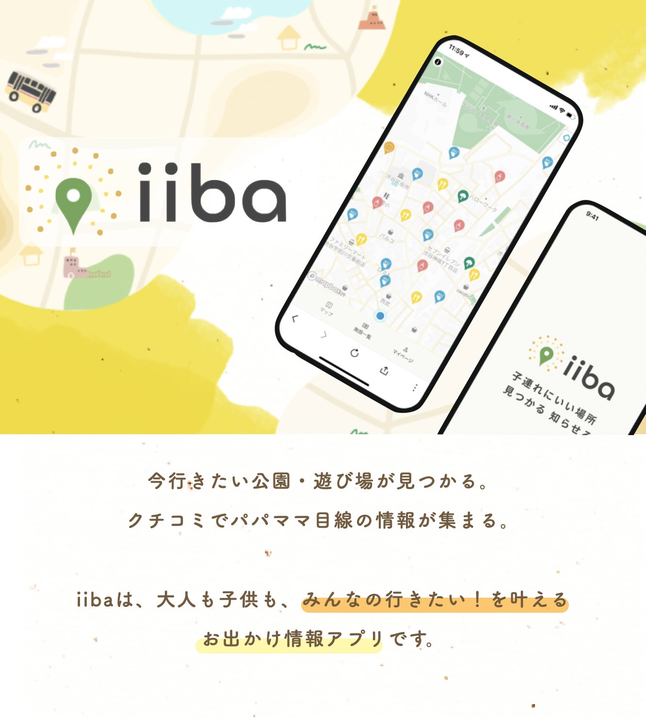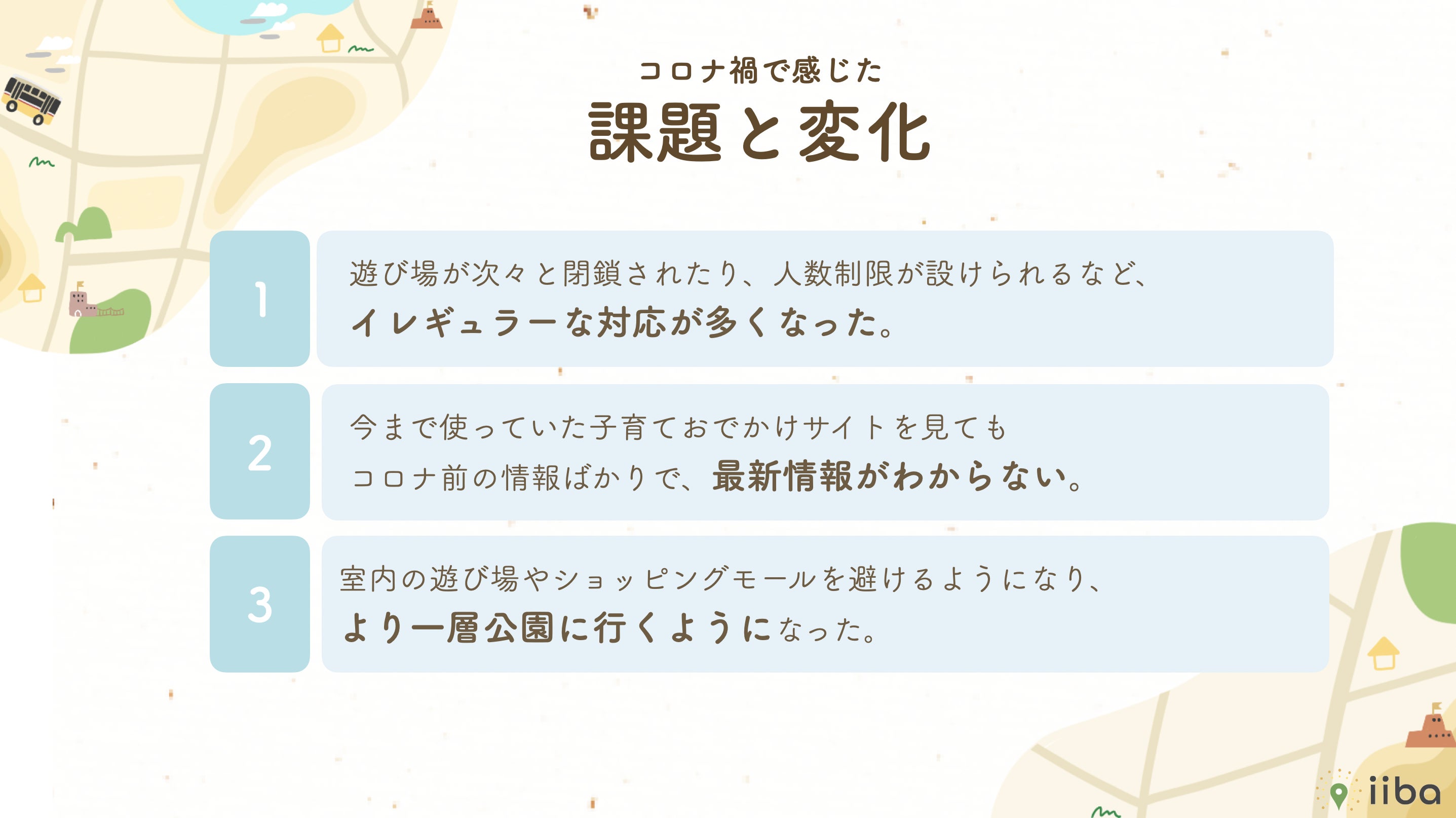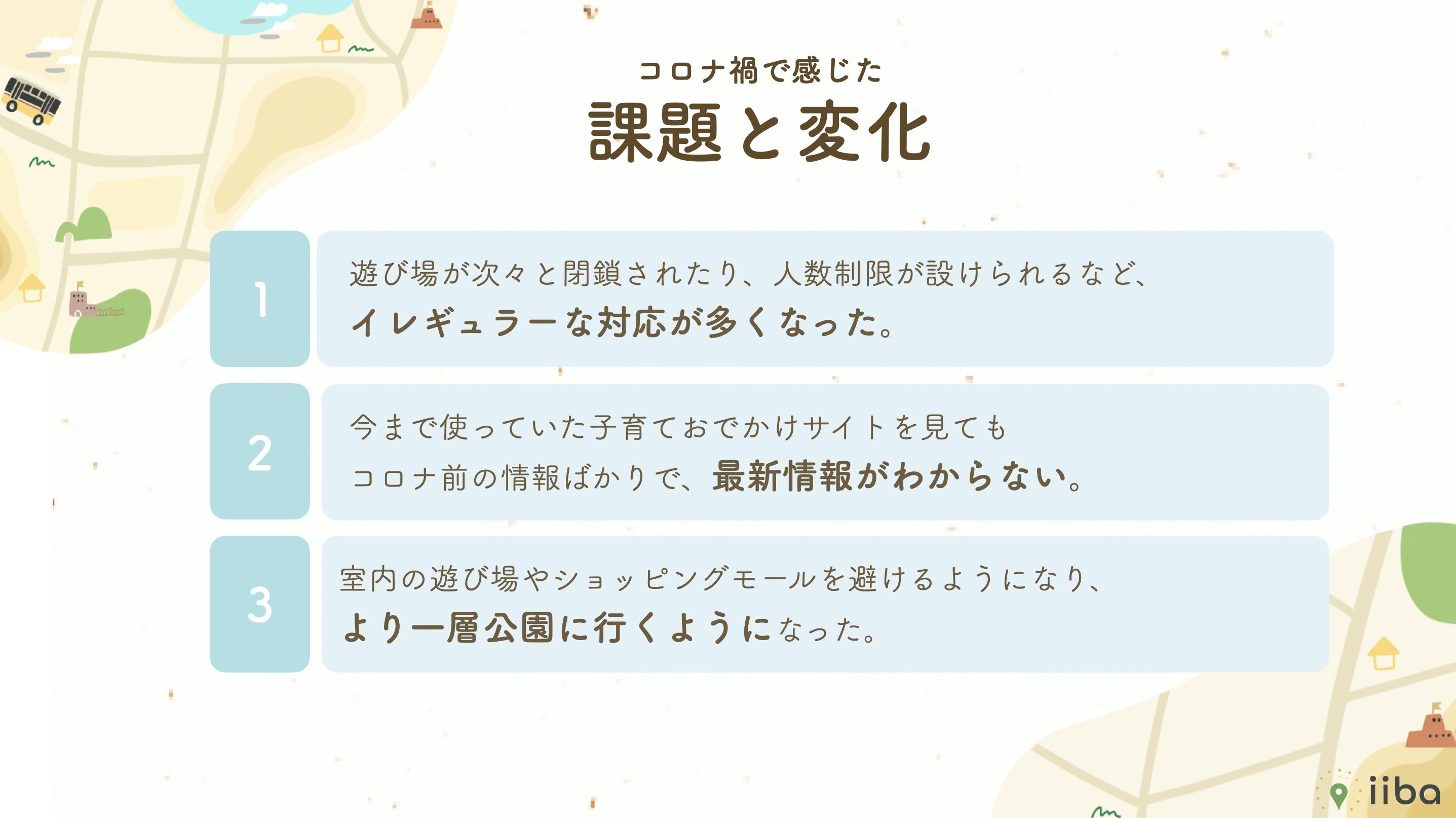 子どもはもちろん、親もワクワクするような情報をぎゅっと詰め込み、子育てをする上で本当に便利な情報をマップ上で見ることができれば便利になるのでは・・・!そう思ったことをきっかけにiibaを作り始めました。