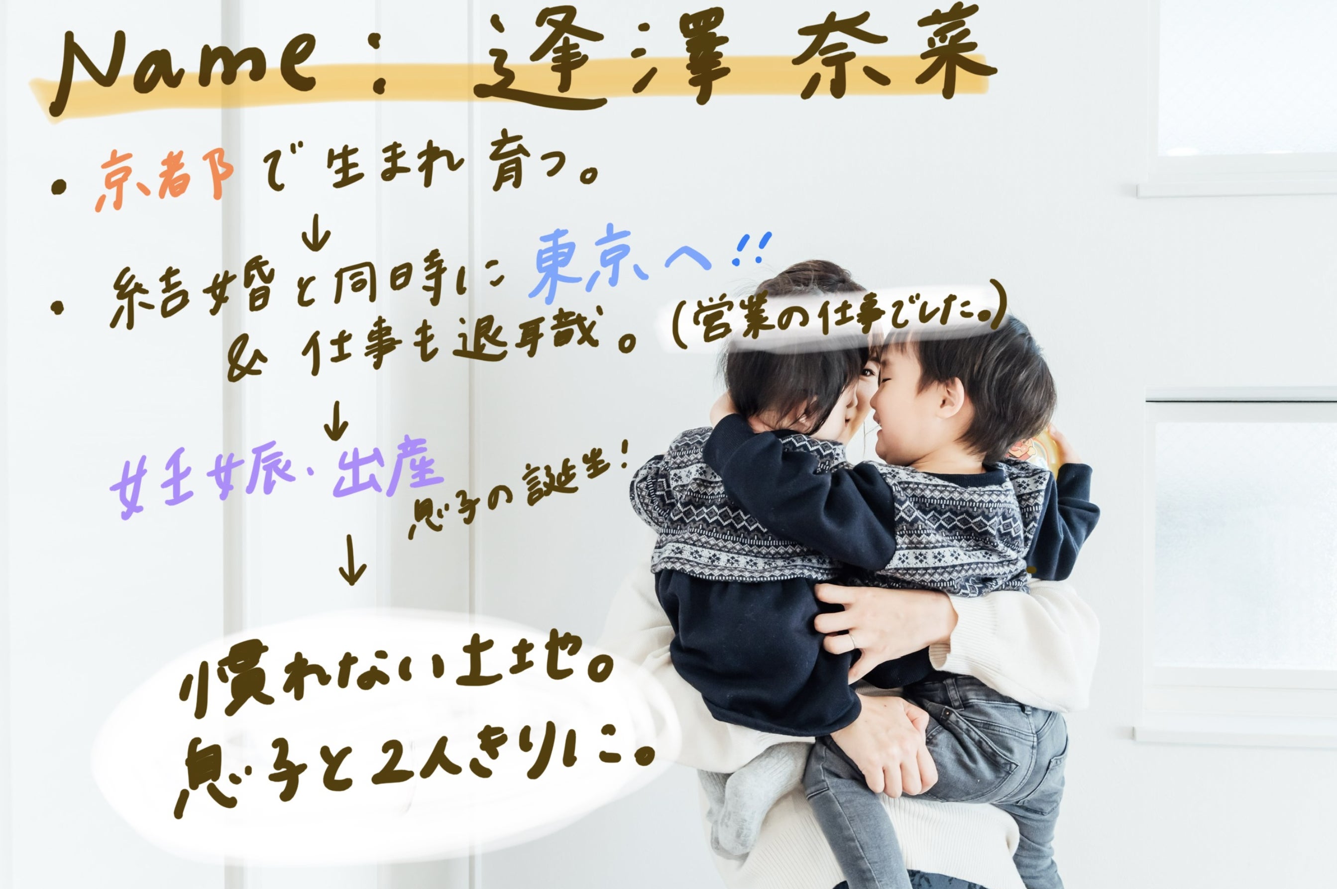 新卒で入った会社では総合職として主に営業をしていましたが、結婚を機に退職。その後妊娠・出産・育児…と次々ライフイベントが重なり、派遣で始めた人事の仕事も長く続けることができず、気づくと慣れない東京で息子と二人っきり。家から一歩も出れない日が何日も続いたり、夫の出張が重なり一週間誰とも会話してないなぁ・・なんて日々を過ごしていました。