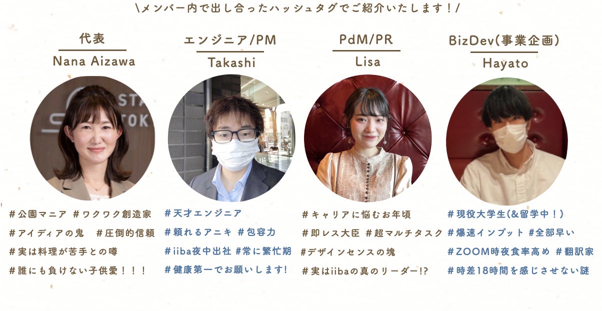 iibaは現在、上記メンバーで活動しております。まずは代表自身が「便利!」「使いたい!」と心から思えるようなアプリをメンバーと共に開発し、パパやママの声を取り入れてブラッシュアップすることで、世の中のパパやママに楽しい子育てライフを実現していただくため、日々活動しております。