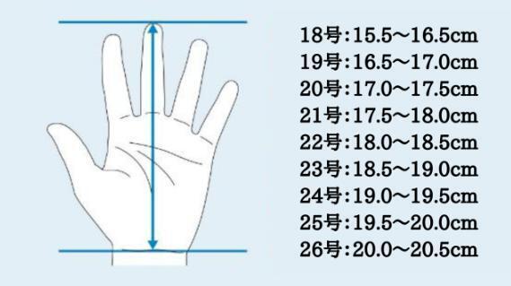 中指の先端から手首まの長さを計って頂きサイズ表を参考にして頂けると良いかと思います。