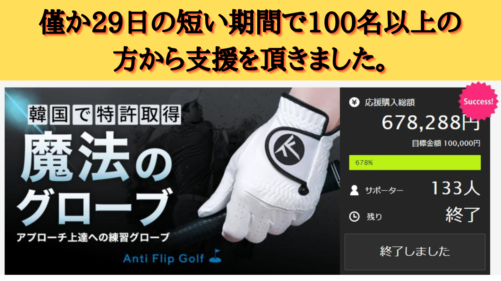 2022/08/29 05:46お世話になっております。ポッシブルの西島です。この度、アンチフリップゴルフカードグローブへのご支援を頂きまして誠にありがとうございました。これより製造元へ商品の手配を掛けて支援者の方々へ商品の発送をしてまいりますので今しばらくお時間くださいませ。9月中にはお届け予定ですので何卒宜しくお願い致します。 もっと見る明日でプロジェクト終了のお知らせ