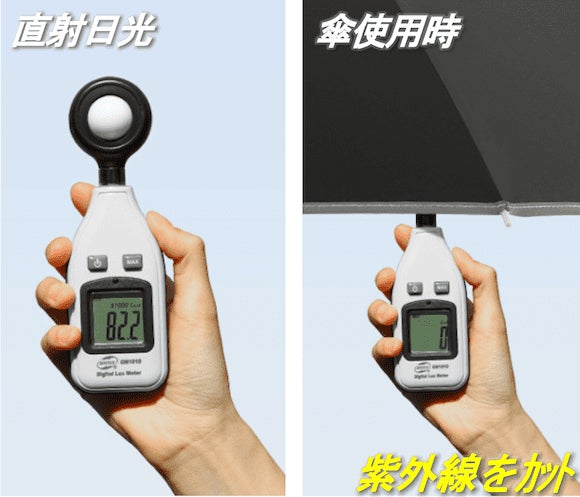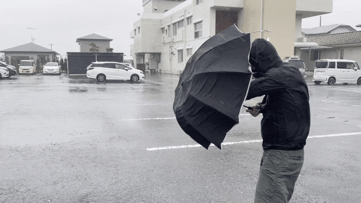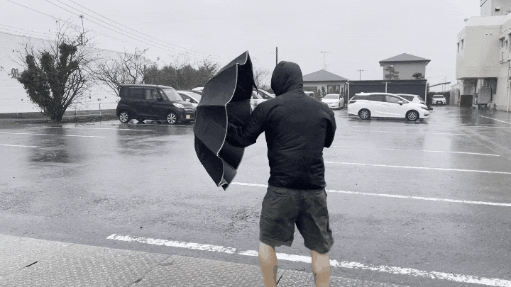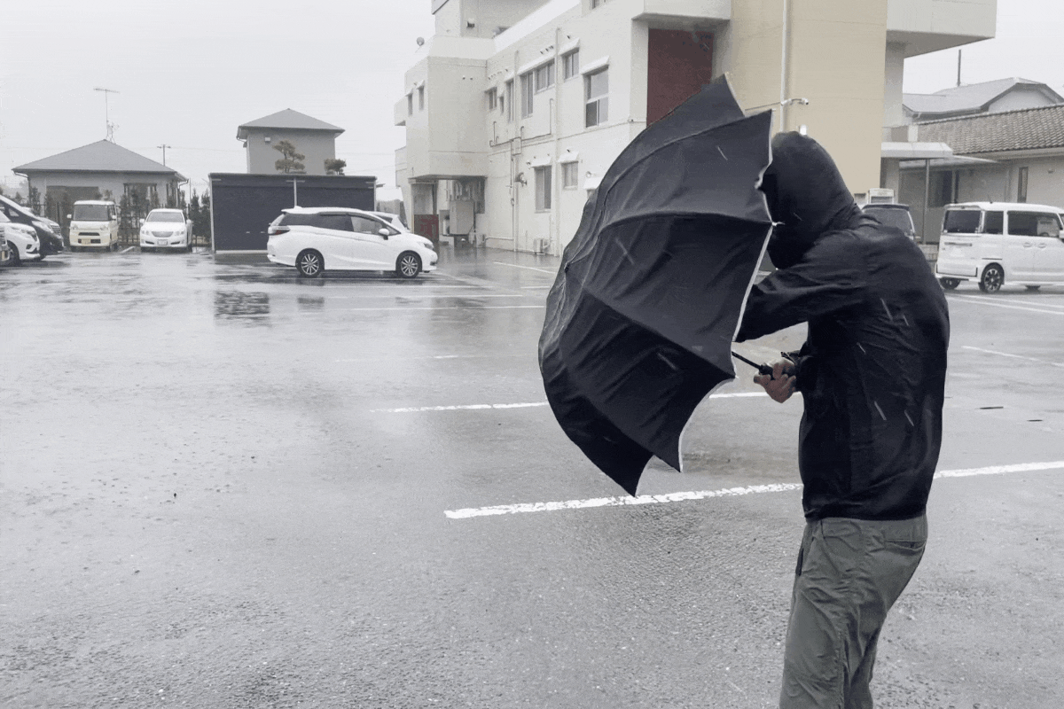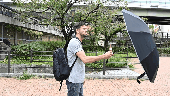 傘を開いた状態で風下側に45度傾け、風速15m/sの風を2秒送風する試験にも耐え、開閉操作への異常や骨各部への亀裂や破損がないことを確認!