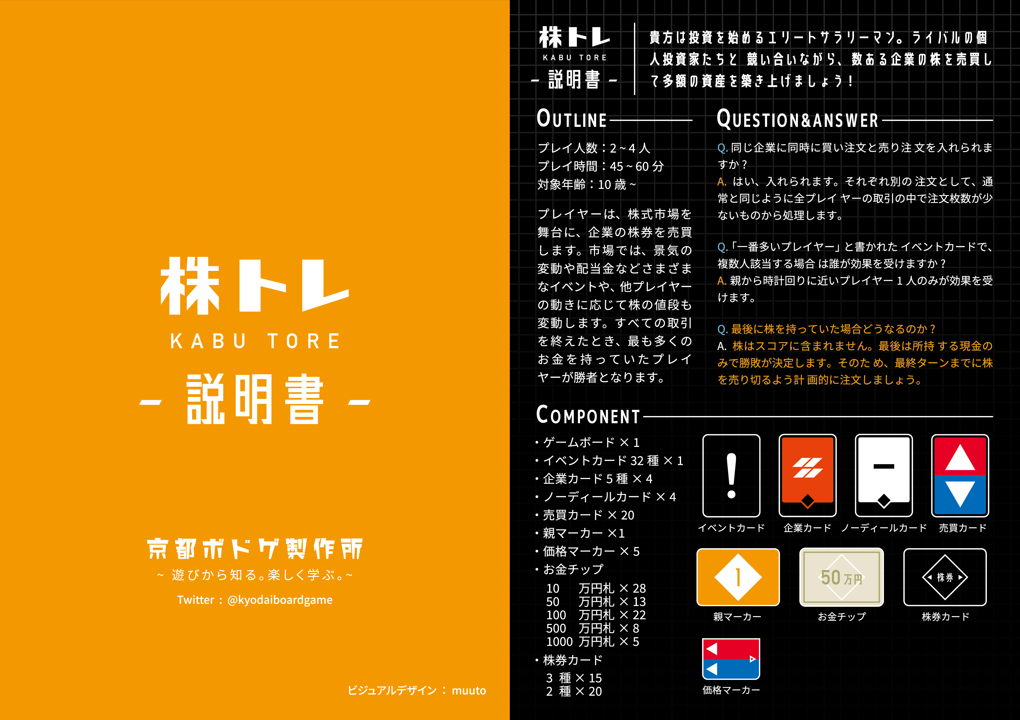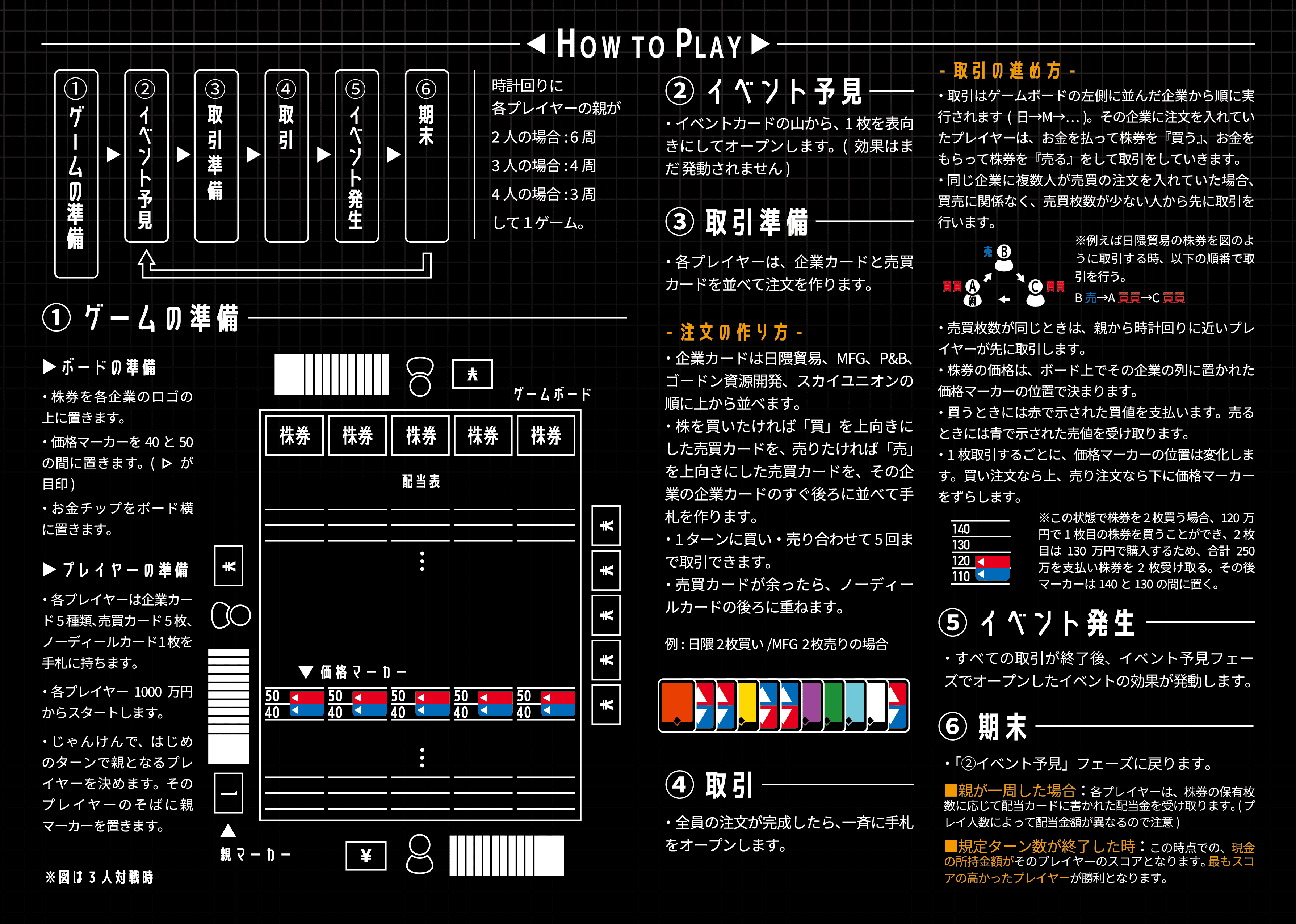 ゲームボード×1 イベントカード×32 企業カード×20 ノーディールカード×4 売買カード×20 親マーカー×1 価格マーカー×5 お金チップ×76 株券カード×85