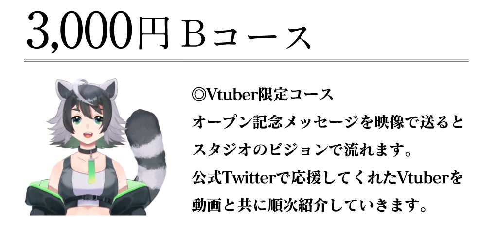 2022/05/04 09:20「Stutio TOKI(スタジオトキ)」にできるVRスタジオでは、モーションキャプチャシステムやクロマキー撮影対応、ライブ配信など、VR(バーチャル・リアリティ)に関するさまざまな取り組みを展開していきたいと考えています。その一環としてVTuber(を所有する支援者)を対象にした、オリジナル返礼品をご用意しています。ぜひご支援、応援のほどよろしくお願いします。▼VTuber用オリジナルロゴの制作についてご支援者さまが所有するVTuberのオリジナルロゴを制作します。提案に対する修正は2回まで対応、納品後の修正対応は不可。デザインのご相談及び、納品は5月以降の順次対応となります。納期についてはご相談をください。※ロゴの著作権は株式会社トキ・テックに帰属します。商標登録を希望される場合別途ご相談ください●ロゴイメージ※バーチャル・タレントプロダクション「KEMONO.ME(ケモノミー)」▼オープン記念メッセージ動画(30秒)をご提供いただける場合※支援者の皆さまから30秒程度の動画素材(MP4データ)を提供いただき、6月4日(土)に実施するオンライン完成祝賀会、スタジオオープン時から6月30日(木)まで、施設内ビジョンでの映像配信、そして「StudioTOKI」の公式Twitterで提供動画と共にご紹介します。支援者様は施設の公式YouTubeチャンネルで紹介する際に必要となるアカウント名などを教えていただくこととなります。ただし、この目的沿わない動画については、紹介を控える場合があります。このリターンを選択する▼オープン記念メッセージ動画(15秒)をご提供いただける場合※支援者の皆さまから15秒程度の動画素材(MP4データ)を提供いただき、スタジオオープン時から6月30日(木)まで、施設内ビジョンでの映像配信、そして「StudioTOKI」の公式Twitterで提供動画と共にご紹介します。支援者様は施設の公式Youtubeチャンネルで紹介する際に必要となるアカウント名などを教えていただくこととなります。ただし、この目的沿わない動画については、紹介を控える場合があります。このリターンを選択する ーオンライン完成祝賀会 について-詳しくはこちらをご覧くださいhttps://camp-fire.jp/projects/546118/activities/374797#main<募集方式について>本プロジェクトはAll-in方式で実施します。目標金額に満たない場合も、計画を実行し、リターンをお届けします。 もっと見る