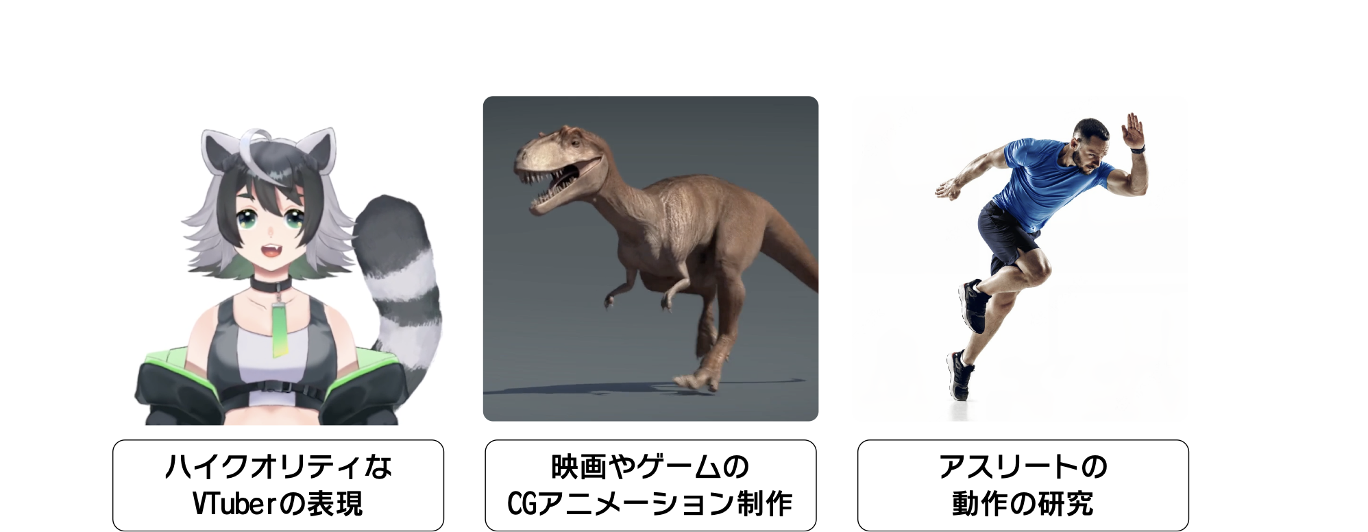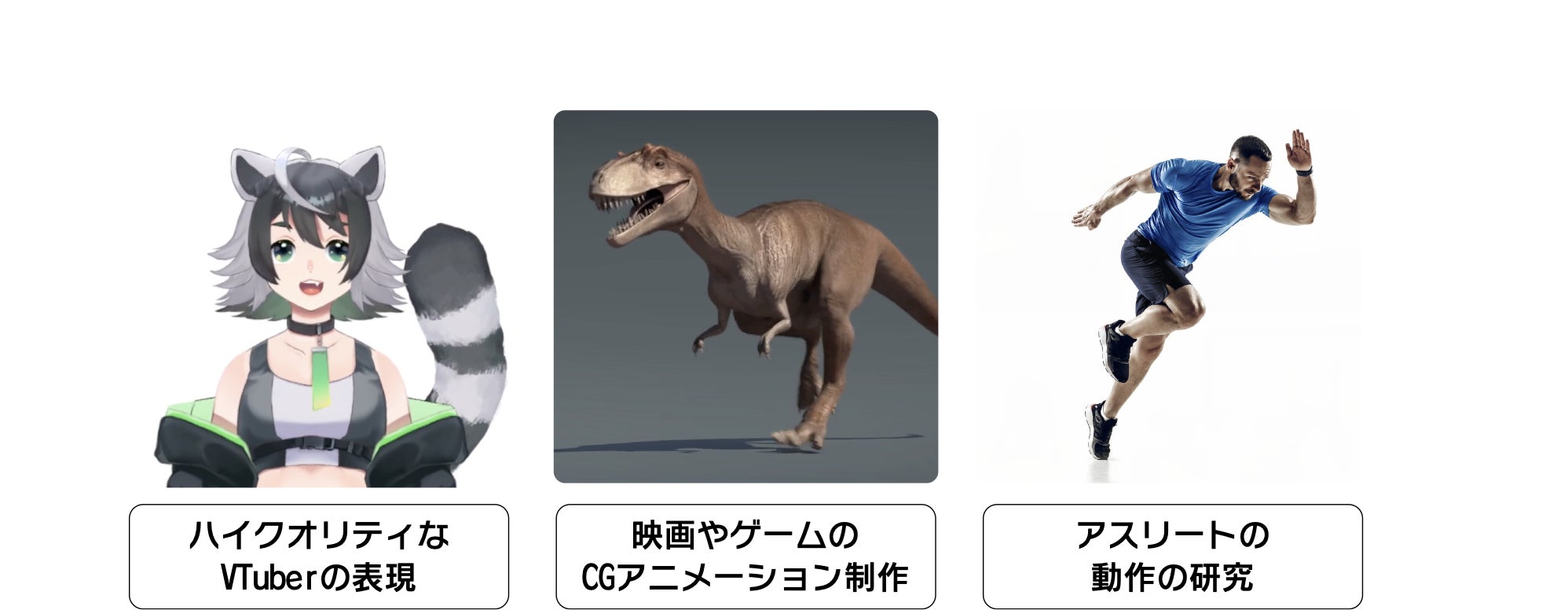 モーションキャプチャーの活用はさまざまですが、例として上げるとしたら3Dモデルを使ったライバー・VTuberです。個人・企業問わず3Dモデルを大きな場所で使いたい、多人数で企画をしたいというユーザーに貢献できるのではないかと思います。