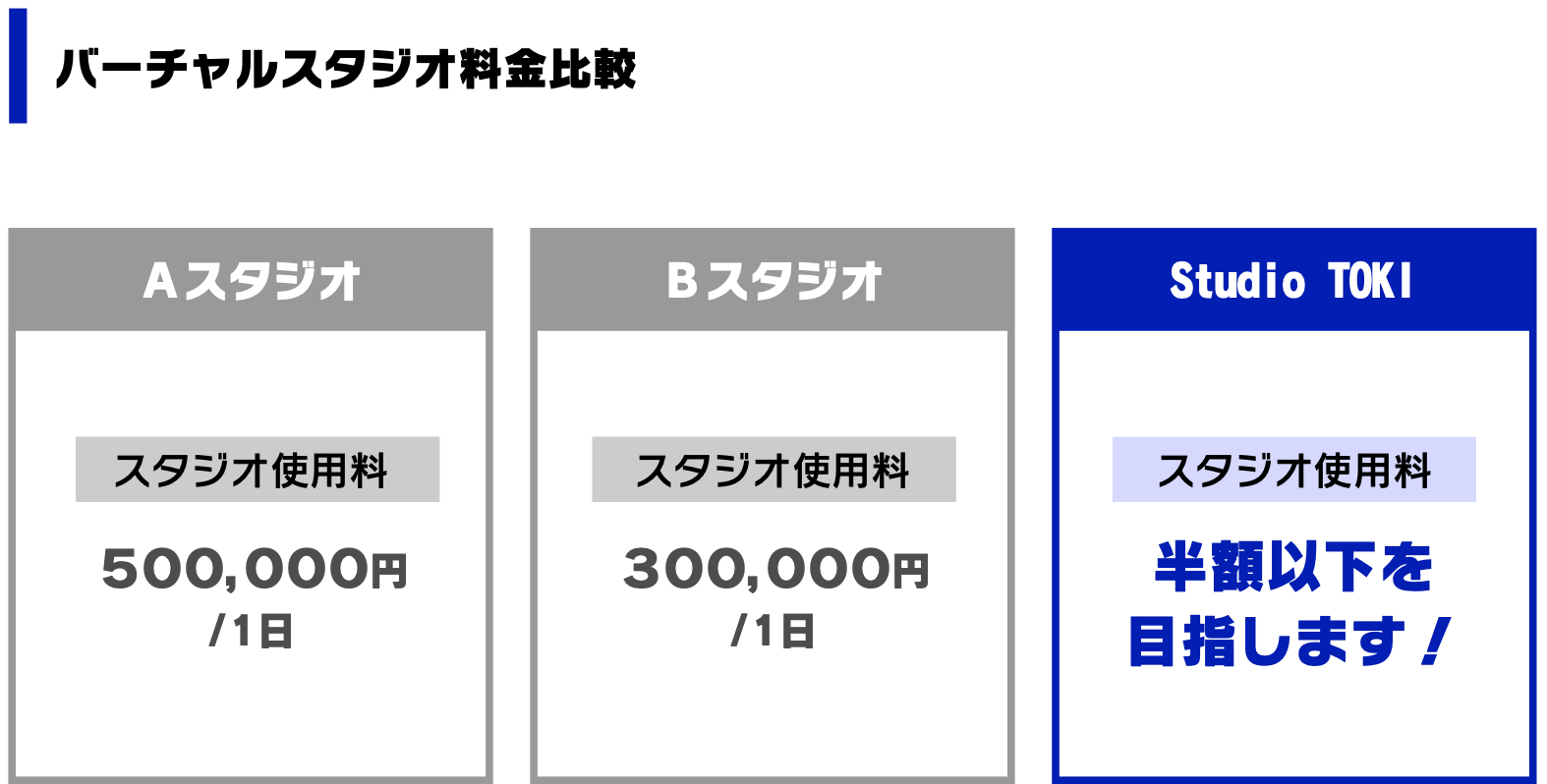 私たちが手がける「StudioToki」ではその課題を解消し、品質の高い機材をそろえたレンタルスタジオとして、お値打ちな価格でクリエイターの皆さんに利用してもらうことを目指します。そして、さまざまな“あたらしい表現を実現できる場所”としての意味を築きます。