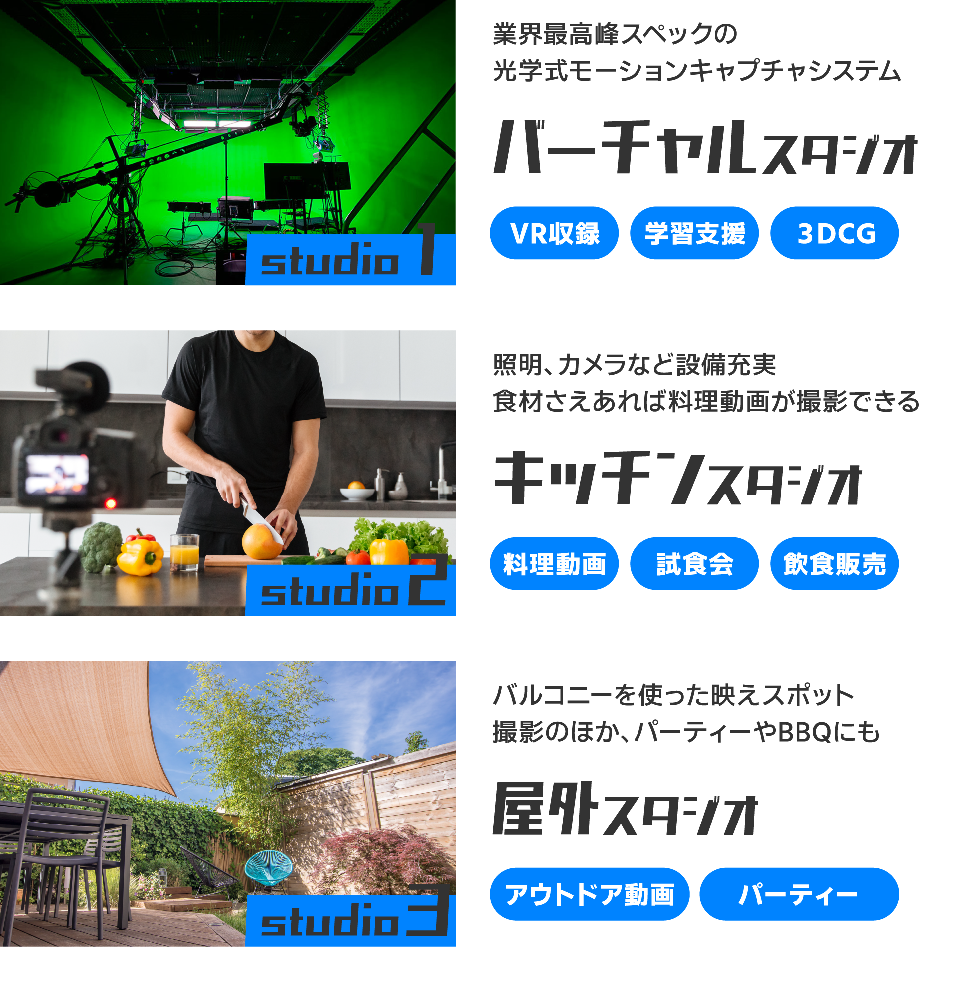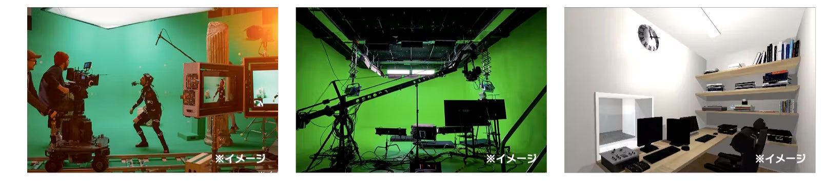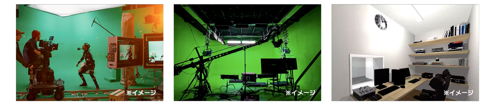 CGキャラクターにアニメーションをつけたり、Vtuberの動きを滑らかに表現したり、スポーツ選手の動きを分析できる最新鋭のモーションキャプチャーシステム、そのほか撮影に必要な機材やクロマキーも完備し、撮影・表現の幅をグッと広げられるような環境を整えます。