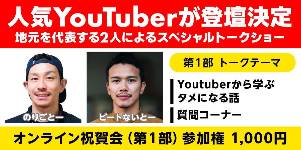 オンライン完成祝賀会では、施設のご紹介のほか、ゲストに愛知出身の人気YouTuber のりごとーさん&ビートないとーさんが出演。マルチクリエイターとして活躍中の2人が、これからのYouTube事情、映像づくりのノウハウ、YouTubeでは公開していないここだけの話など、さまざまなトークを繰り広げます。また、視聴者の方からの質問コーナーをご用意!ゲストがコミュニケーションを図りながら、普段聞いてみたかった疑問などにお答えしていきます。