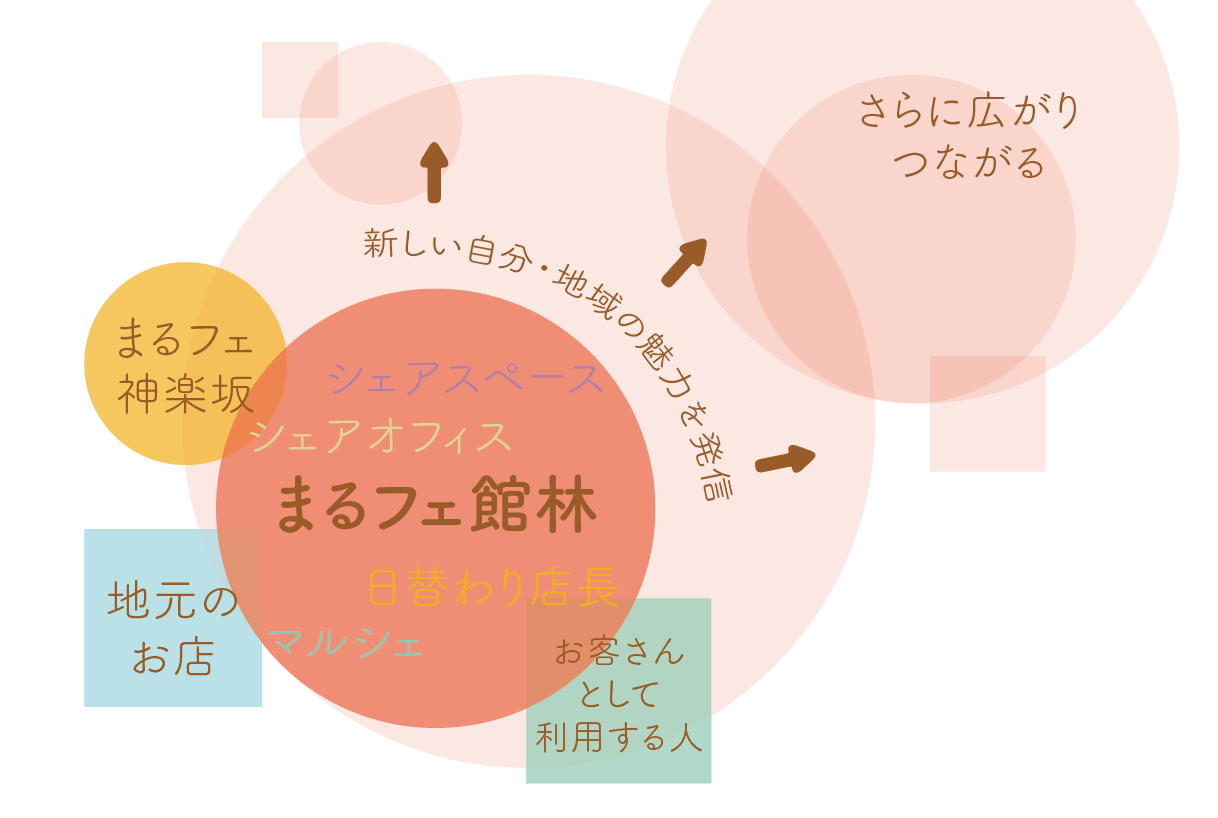 まるフェ館林では飲食スペースとイベントなどで使えるシェスペース、コワーキングスペースを設置します。まるフェ館林を訪れて利用することで地域の人と繋がる、飲食スペースやシェアスペースから発信する場所として繋がりをつくる、コワーキングスペースで多業種の人と繋がる、いろんな可能性を秘めています。