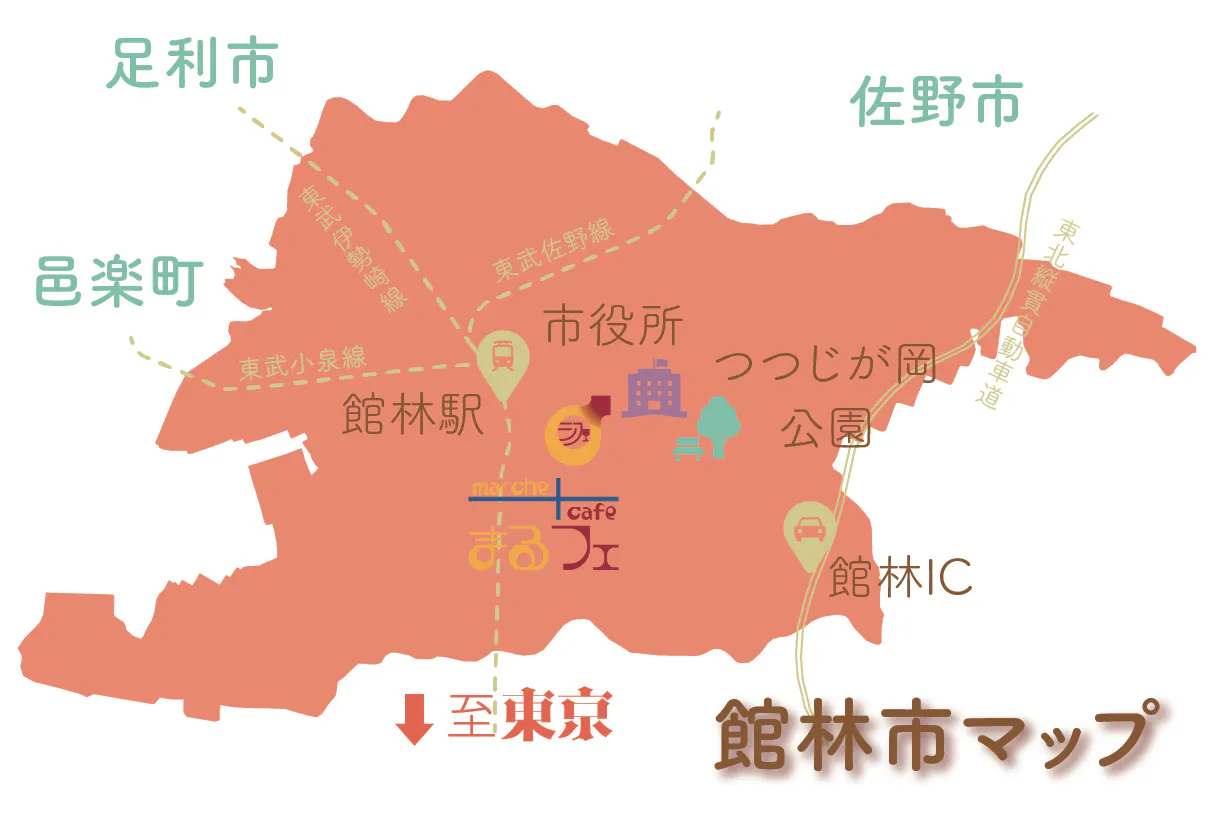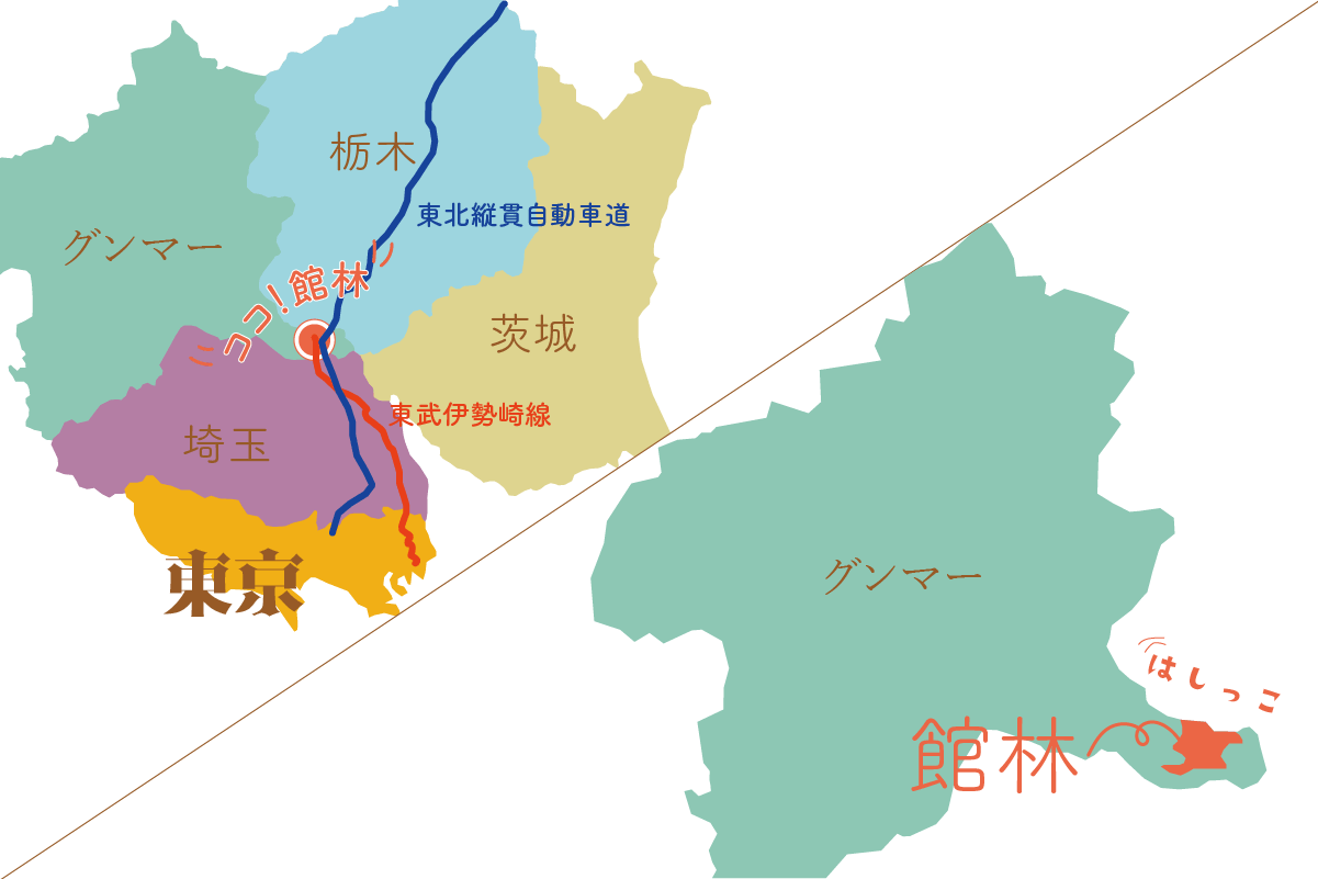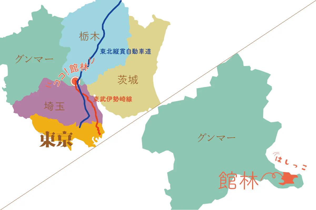 館林は群馬県のほぼ南端の末端に位置します。市内東側には東北縦貫自動車道が通り、館林駅は東武伊勢崎線始発・終着駅でもあるため首都圏から群馬県を出入りする際に一度そこで降りなければならない…そう、”関所”…!通り過ぎるだけでなく乗り降りするのに立ち寄ってもらえるので、首都圏や埼玉・栃木・茨城と行き来する人たちにとっても、群馬県の関所としてそれぞれの仕事・事業の繋がり、発信する場を目指します。
