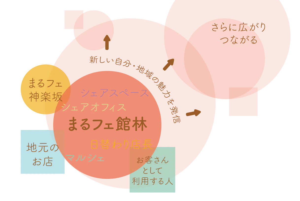 この場所でまるフェ館林は地域の交流や発信ができる場所として、繋がりの場となります。地域のみんなが集まり繋がる場所としてももちろん、他拠点からのアクセスの良さも利点に、まるフェ館林から館林や群馬の魅力を発信し他の地域と繋がっていく場所にもなります。