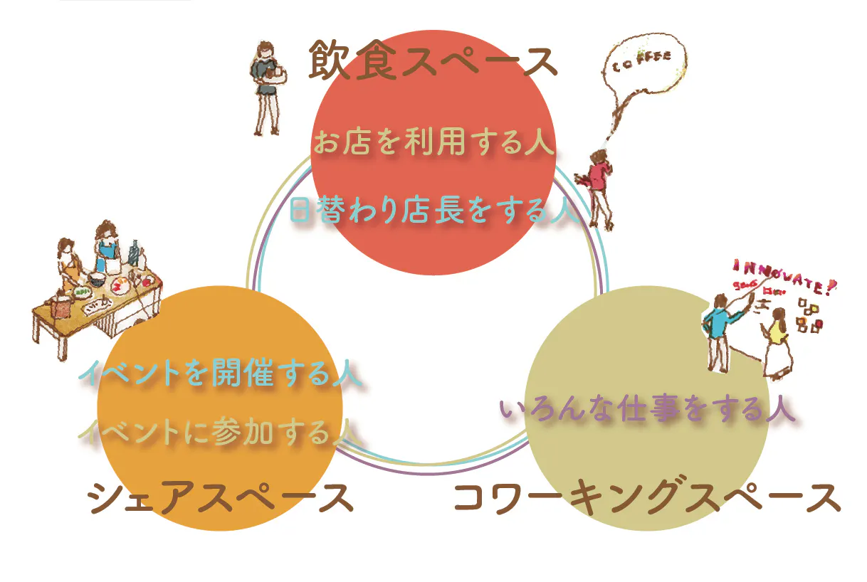 飲食・シェアスペースを主催者側で利用してもらえるようにします。飲食については不特定多数の方の口に入るものなのでしっかり定期的にお店をやりたいという方と話し合って、地域のものを活用しながらできるお店作りを一緒にやっていきます。脱サラしてお店を持ちたい方や、独立前の腕試しにお店を運営したい方の支援にもなるような日替わり店長の形で運営していきます。シェアスペースでは、趣味から一歩踏み出してみたいという方を応援し、気軽にワークショップやセミナーなどをできるようにします。