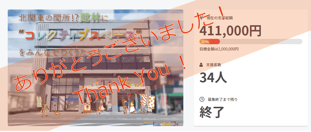 2022/04/05 10:543月31日をもって、プロジェクトの支援期間が終了しました!支援総額:411,000円支援者数:34人ということで、目標金額には程遠い結果となってしまいましたが…それでも34人の方がご支援くださり、411,000円という額をご支援いただきました。目標額には届かずとも、これはかなり大きな金額で、これだけの額、これだけの人が支援して下さったという事実は金額には代えられない価値があります。本当に心から感謝致します。ありがとうございました!!この34名の支援者の皆様にはそれぞれの返礼を準備してまいります!この返礼品に関しても、多くのお店様や企業様にご協力頂いており、このまるフェというお店のシステムや館林という地域の魅力を知って頂くのにぴったりの素敵なお品をご用意しています。ぜひご期待ください!そしてこのプロジェクトですが…元々まるフェ館林をはじめるにあたり運営費用、内容工事費用などを賄うというのが一点、そしてこのプロジェクトを通して皆様に広く知って頂くというのももう一つの目的でありました。費用の面でいうと、まだまだ足りない現状ではありますが、運営していくと決めた以上はどうにかしてまた資金を練っていくしかありません。またいろんなツールを駆使して考えています!皆様に知って頂くという点では、本当にいろんな地域いろんなジャンルの方に知っていただけたのではないかと思います!そういった方々がなにかの機会にまるフェ館林に訪れてくだされば、それもまた一つの支援になります。ぜひ今後ともよろしくお願いいたします!また返礼品の準備状況や、今後の活動について活動報告あげていきます!重ね重ね、今回のプロジェクトに対するご支援、本当にありがとうございました。今後とも、どうぞよろしくお願いいたします! もっと見る