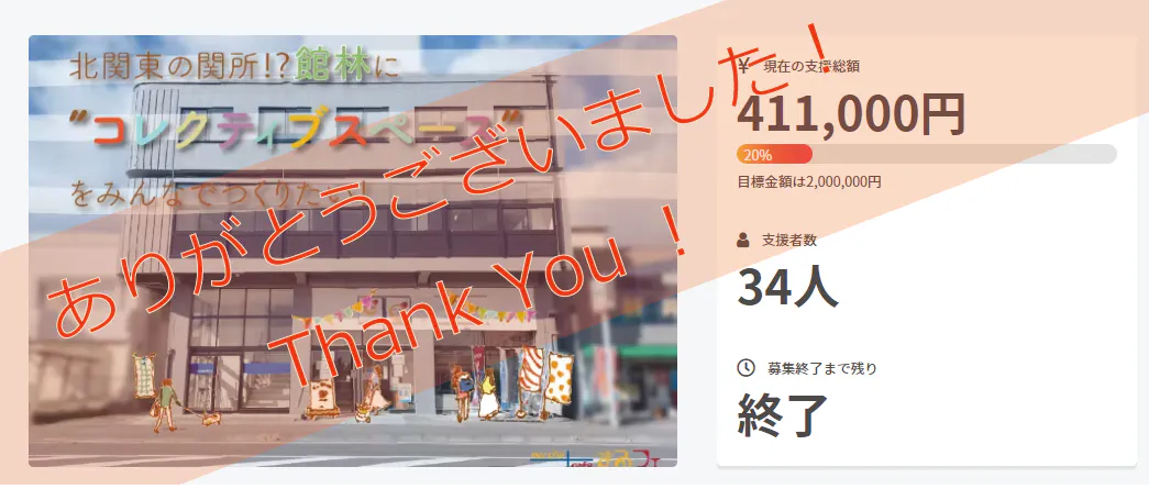 2022/03/31 11:12いよいよ本日が「 【館林】北関東の拠点はここだ!館林にみんなでコレクティブスペースをつくりたい! 」プロジェクトの支援受付最終日となりました。まずは、ここまで支援してくださったみなさん、本当にありがとうございます!そして、本日23時59分まで支援はOKです!今日、最後ということで目にしてくださった方、もう一押ししたいという方、ぜひご支援をお願いいたします。このクラウドファンディングは一つの賭けのようなものでした。みんなそれぞれやりたいことや夢や目標ってありますよね。それを誰かが支援してくれるならそんな嬉しいことはないです。今回このプロジェクトについて、クラファンで支援を募るとなったとき、本当に人様に支援して頂く価値があるのか、本当にそれだけのことができるのか、またその価値を伝えられるのか、いろいろと悩みました。結果としてこれだけ多くの方が支援して下さって、応援して下さった。本当にありがとうございました。今日が”支援の最終日”ではありますが、このプロジェクトはまだまだ最終日ではありません。まずはリターンを楽しみにして頂いてる支援者の皆様にリターン品の準備も始まりますし、支援がこのプロジェクトの全てではないので、今後も活動報告は続けます。そしてリターン品も全て届けて、このプロジェクトが終了しても、「まるフェ館林」にとってはこのプロジェクトは一つの手段であり、通過点でしかありません。このクラファンプロジェクトをきっかけに知ってくださったみなさんに、きちんとコレクティブスペースとして運営する姿をお見せしたい!今回目標金額には届きそうにはないので、またしばらくはどう運営していくか試行錯誤の日々にはなりますが、このプロジェクトが終わってもいろんな形でこれからも応援・協力していただければと思います!!!重ね重ね、ご支援いただいた皆様本当にありがとうございました!そして、あと、約12時間、あるでよ~!まだ支援待っとるでよ~!よろしくお願いいたします! もっと見る