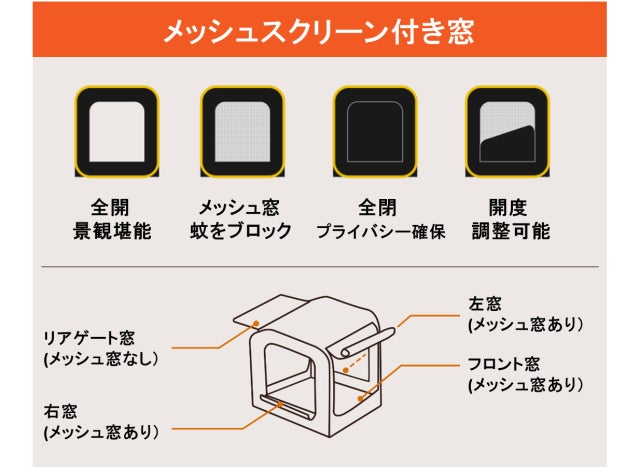 CARSULEの特徴である大きな窓にはメッシュスクリーンがついており、虫の進入を防ぎながら新鮮な空気や景色を楽しめます。