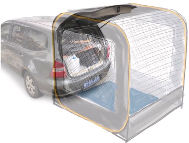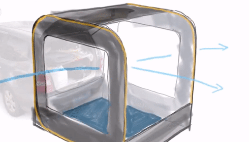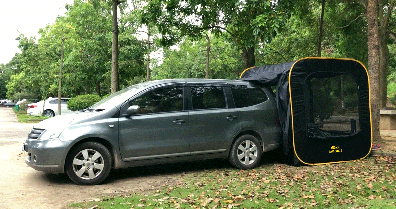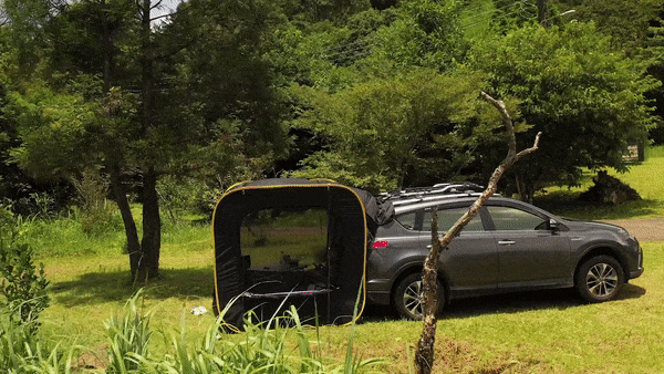 テントだけでは大きなスペースが必要となる為、コンパクトに仕上げるのは難しいと考えました。そこで車のトランクスペースを有効利用するアイデアが生まれました。