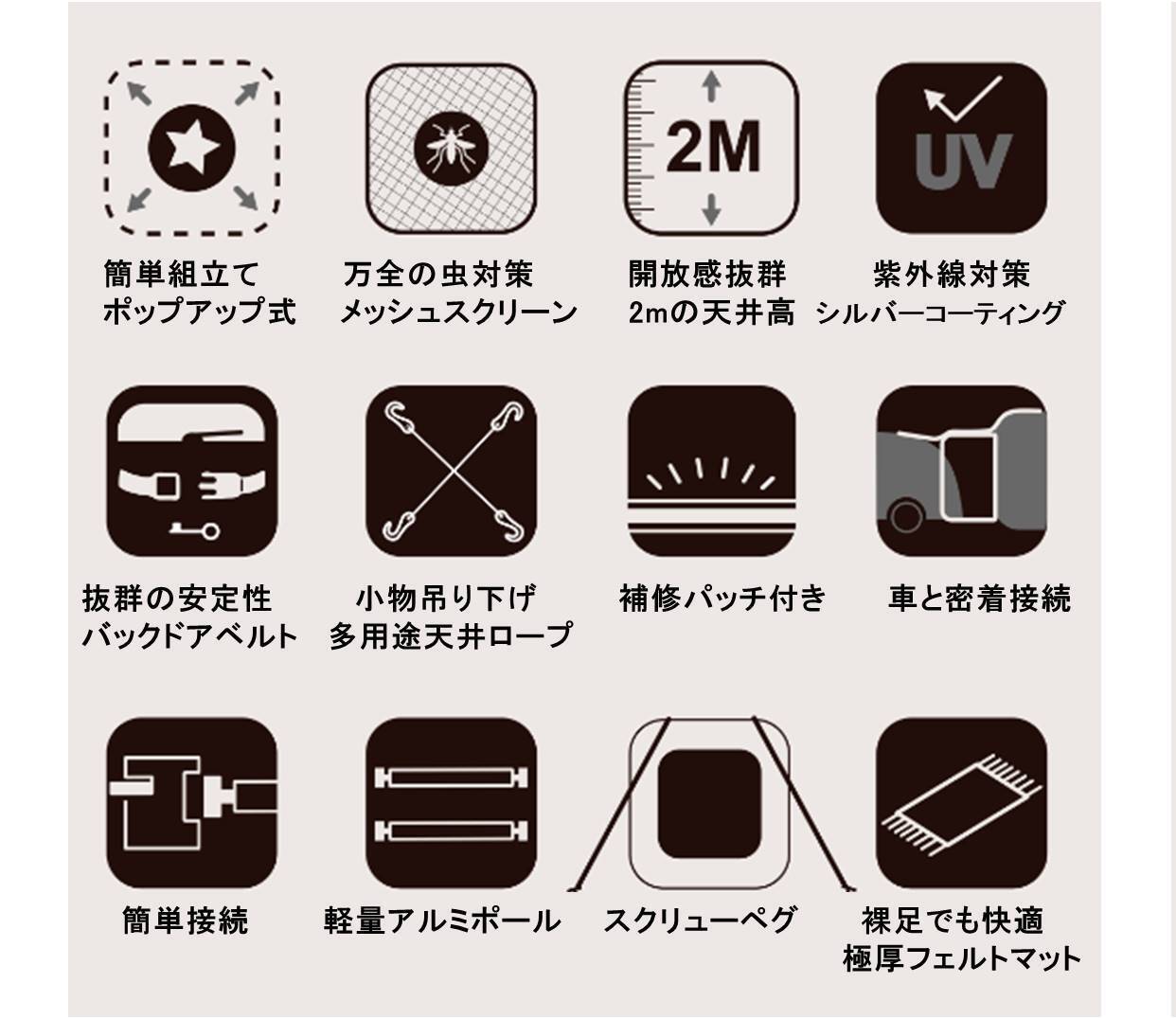 通常のテントと異なり、どのポイントも高さが2m(CARSULE PLUSは2.2m)あるので圧迫感がなくデッドスペースが存在しません。見た目はコンパクトですが家族や友人と談笑したり、テーブルを広げて作業をするのに十分なスペースがあります。