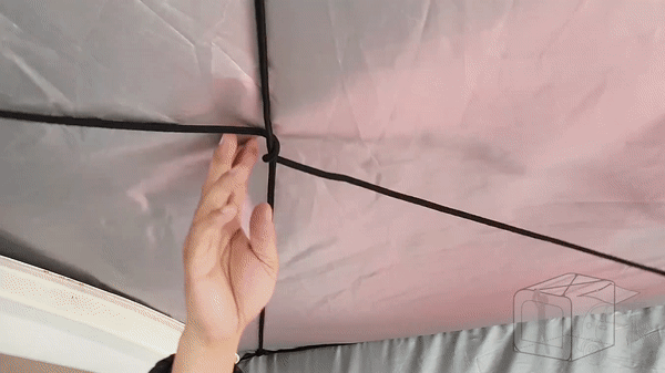 天井のテンションロープはテントの変形を防ぐ目的に加え、色々なものを吊り下げることができる便利なロープとしても機能。ライトや小型扇風機などの小道具を付けると室内が快適に!