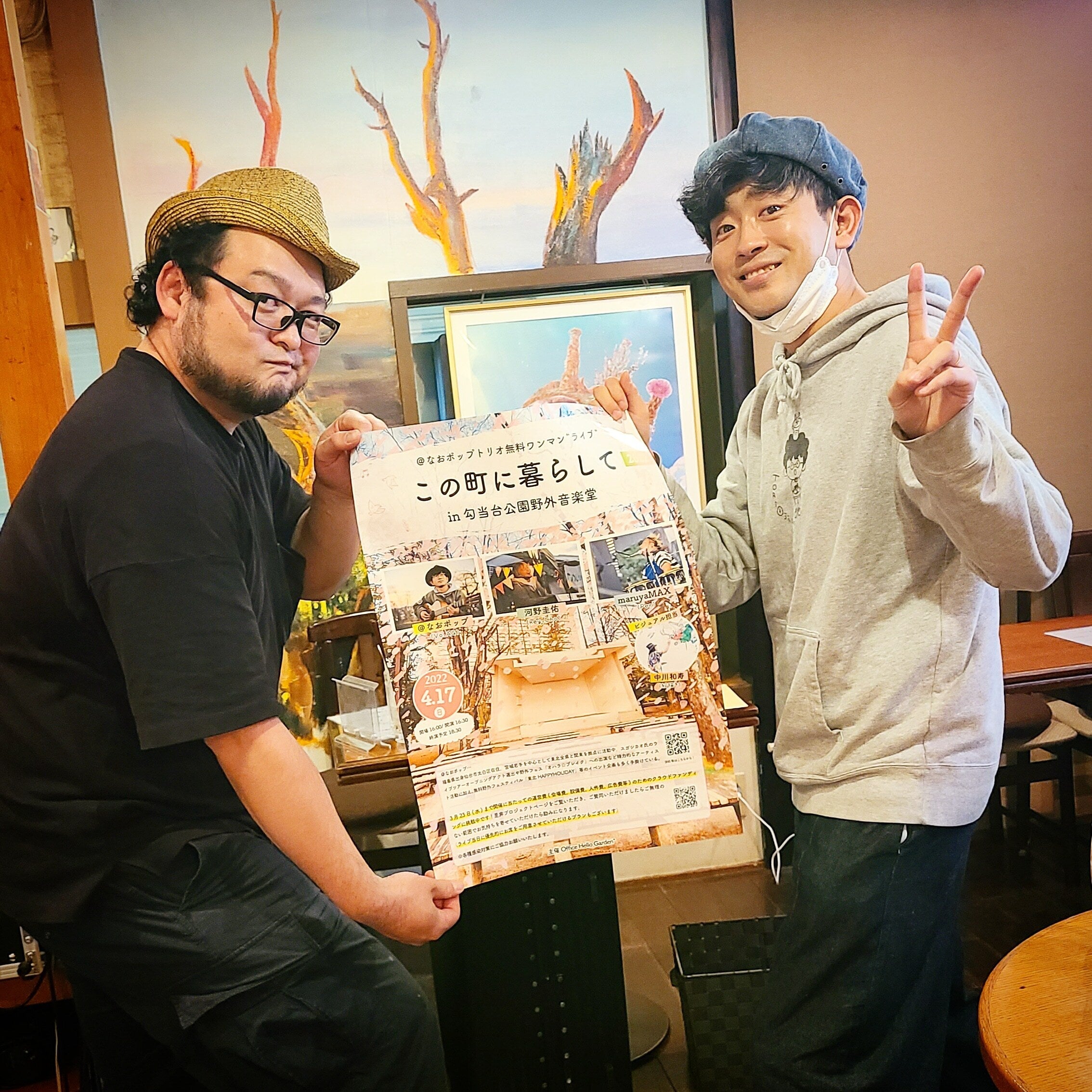 こんばんは!@なおポップです。開催まで3週間を切った本日、無事に会場となる勾当台公園野外音楽堂を管理されている仙台市は青葉区役所さんへ使用申請を終えて参りました^^東北HAPPYHOLIDAYhttps://tohokuhappyholiday.jimdo.com/でもお世話になっている窓口で、いつも本当に気持ちよく親切にご対応いただいております。感謝でございます。そして、先週の土曜日にはこの場所にポスターお渡しできました!仙台のライブカフェ、Cafe de Lucilleさん!https://www.again-and-again.com/cafe-de-lucille/何度かライブイベントでもお世話になっている会場で、仙台の街中の会場にも関わらず、とてもミュージシャンに寄り添った対応をしてくださる三浦さん。建物屋上にもライブができるスペースを提案していたり、なんと最近では秋保地区に野外ライブができる会場の運営もはじめたとか!ライブを楽しみたいみなさんはもちろん、いろんなことに挑戦してみたいミュージシャンのみなさんにも是非知っていただきたい場所ですね^^ちなみに土曜日ぼくは傷彦(ザ・キャプテンズ)さんと登山正文(私の思い出)さんのツーマンライブの配信担当としてお仕事させていただいておりました。簡単ですがダイジェストを作らせていただいたので是非に!https://youtu.be/_lOnNjzwLRI開催まで20日!今日も何か所かポスターお渡しできたので、明日以降に^^そして4/17(日)は是非勾当台公園野外音楽堂にお集りいただけたら嬉しいです!【開催概要】■4月17日(日)仙台 勾当台公園野外音楽堂@なおポップトリオ無料ワンマンライブ「この町に暮らして2022」開場 16:00開演 16:30終演予定 18:30出演@なおポップ(Vo,AG)河野圭佑(Key,Cho)maruyaMAX(Per)ビジュアル担当中川和寿(絵描き)※観覧無料※一部クラウドファンディングご支援者優先席あり(スタッフが誘導いたします)企画OfficeHelloGarden*引き続きよろしくお願いいたします!@なおポップ