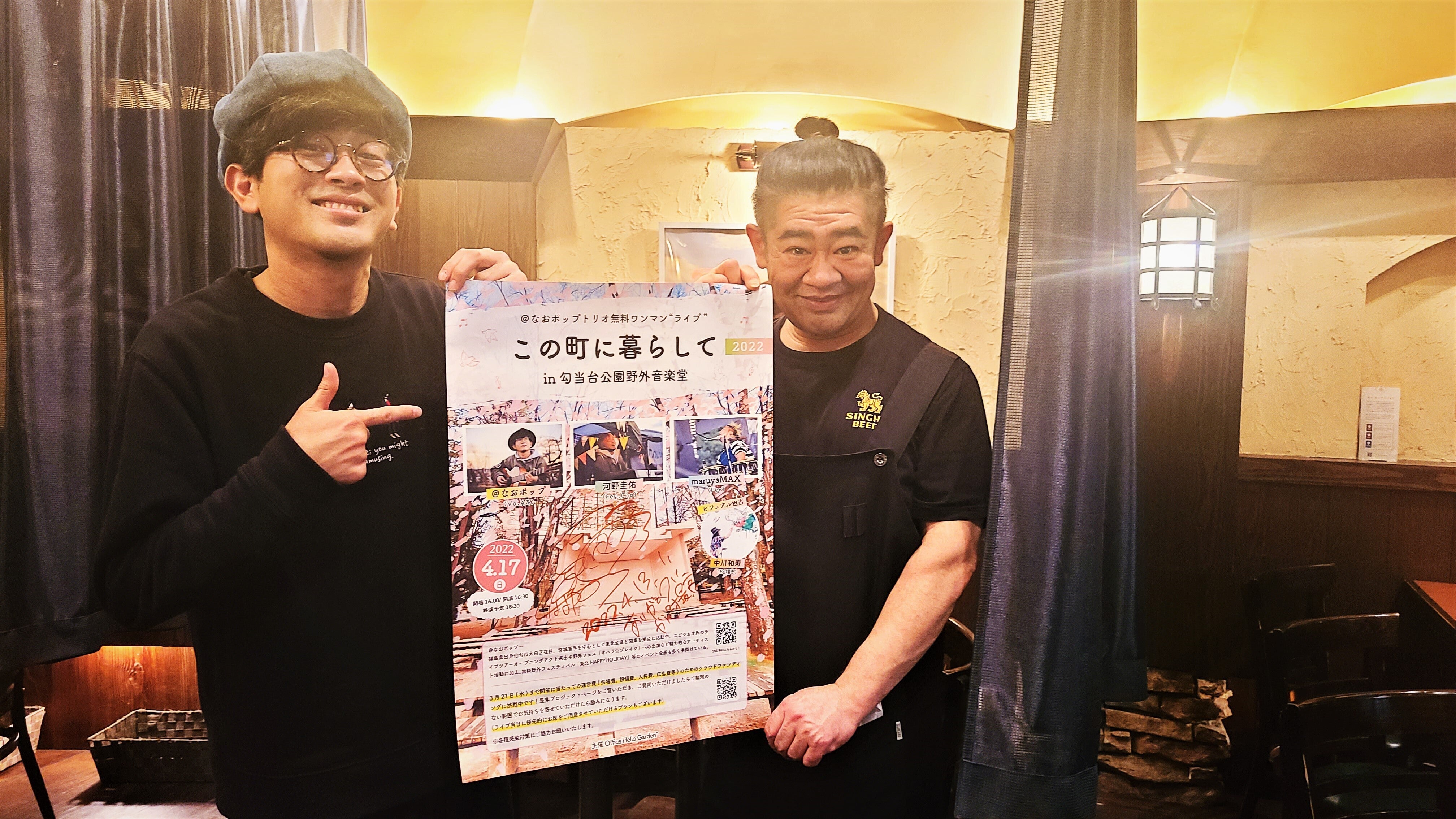 こんばんは!@なおポップです^^本日は朝から勾当台公園の搬入口の鍵を受け取りに行きつつ、耳鼻科で顔(鼻と喉ね笑)のメンテナンスしながら、当日使わせていただくレンタル備品の受け取りや足りないものの買い出しへと走り回っておりました。さきほど新たに演奏予定に入れ込んだ曲たちの練習を終えて、今にいたっております。河野圭佑が療養のため出演キャンセルとなってしまい、maruyaMAXと2人という編成を基本にお届けすることになった今回のワンマンライブ。けーちゃんがそこにいないという寂しさを塞ぐものは見当たらないわけですが、だからと言って、それによって、楽しさが減るようなライブには絶対にしたくないんです。ぜったいに。他の方法で別の光を射し込んでいく方法を考えてはひたすら電話…をして、当日、スペシャルな仲間たちが駆けつけてくれることになりました。まずは、この人。長利和季https://twitter.com/osari_kazuki持病との闘病の中、ドクターからの演奏許可がおりたとたん、仙台のBARTAKEさんを1か月毎日貸切ってゲストを呼んでツーマンライブをする!という、ぶっ飛んだ企画を打ち出して笑、嬉しいことに僕を最後のゲストとして誘ってくれたのをきっかけに仲良くなれたミュージシャン。オファーを受けた時、まだ良く知らない仲なのに「そんなことして大丈夫なの!?」とめっちゃ突っ込んでしまったのを思い出しますが笑、その姿勢と行動力で一気に大好きになった人です。長利はシンガーソングライター。当日、ピアノを弾いてくれるのはもちろん、1曲弾き語りも披露してもらいます。何を歌うかはお楽しみに!それから、もうひとつ目玉があるのですが…それは当日のお楽しみに(笑)2人目はこちら!庄子直輝https://twitter.com/springfieldnsgt僕のワンマンライブなどでも何度か一緒に演奏してくれているので、ご存じの方もいるかと思いますが、それはもう色っぽく、メロウなギターを弾く仙台のギタリスト。本当にギターが好きで、本当に音楽が好きで、本当に@なおポップを好きでいてくれる人の一人。とても素直な人間で、話していても、一緒に音を出していても、それがストレートに伝わってきて嬉しくなります。最近では、SaS Sound Projectというインストゥルメンタル(歌のない音楽ね)の活動もしていて、初回の配信のお手伝いもさせていただきました。(長利も参加しております)今回僕にとっても初のナオキの一面が見れます。「なおさんのワンマンなんだから!」と、僕たちに寄せた衣装で登場してくれることになりました!笑そうゆう気遣いも、嬉しいね。この2人が、数曲ずつ交互に参加してくれたり、4人で演奏する時間も予定しています。明日のリハーサルで初めて合わせます。ミュージシャンたちの底力を、みんなで見せたいと思うので、楽しみにしていてね。最後に、直前になって気づいたことがあります。司会!!!!!!!!!と笑さすがに、僕が開演前に登場して「さぁさぁみなさん!!」というのは、今回は違うかなと思うし(笑)そこで、開場時に会場MCを担当してくれる仲間も!この人です。高橋大輔https://twitter.com/dai_fanfareかつてよく一緒にライブもしていた同世代の仲間。僕の父と彼のお父さま(OH!バンデスでお馴染みの高橋 佳生さん)も繋がっていて。親子イベントなるものでも共演した日が懐かしい(笑)司会かい!!!笑と思う方もいるかもしれませんが、これには理由があって。今回のライブタイトル「この町に暮らして」というのは、僕が28歳の頃、仙台に住んで10年が経ったときに、初めて挑んだホールワンマンライブのタイトルなんです。この日も大輔には影アナという形でライブを支えていただきました。それが、恐ろしく評判だったのです(笑)出演者、関係者間で「え?これ誰の声?今日ってアナウンサーさんにでもMCお願いしてるの?」と声があがったほどに(笑)あれから8年が経つわけですが、また同じタイトルで新しい形のワンマンライブに挑戦する日。なんかこうゆうのもいいなと。快く引き受けてくれた大輔にも感謝。(久しぶりに飲み行きたいね)急遽というタイミングですが、仙台に暮らす仲間が3人、駆けつけてくれることになりました。これも"この町に暮らして"きたんだな、と思う要素になっております。ものごと、すべてに意味があるかは分かりません。あったとしても、それは運命めいたものではなくて、自分で後付けする度胸と行動力があるか次第なのかもしれません。常にその力と方向が正しいものなのかも分かりません。でも僕は、気を抜いたら崩れそうな毎日でも、とにかく笑いたいと決めた一日を、君と一緒に笑っていたいと決めた一日を、実現することだけを考えて、当日を迎えたいんです。そこで一緒にいてくれたら、嬉しいです。ご来場、お待ちしております!!この後、当日の注意事項や感染対策についてもnoteにまとめるね。【野音ワンマン詳細】■4月17日(日)仙台 勾当台公園野外音楽堂@なおポップトリオ無料ワンマンライブ「この町に暮らして2022」開場 16:0